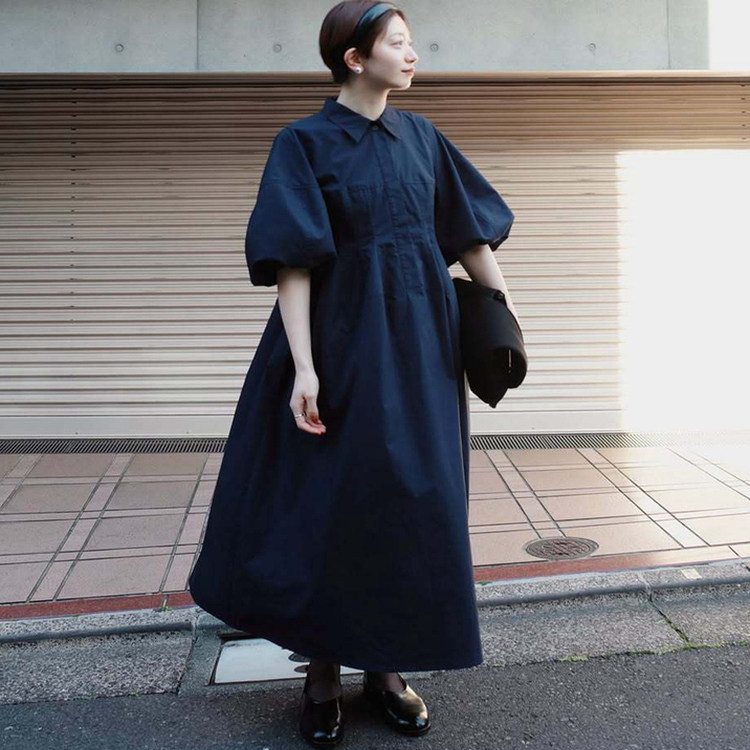 📚 实拍!日系春夏高定松本阔型束腰感翻领灯笼袖连衣裙休闲显瘦长裙