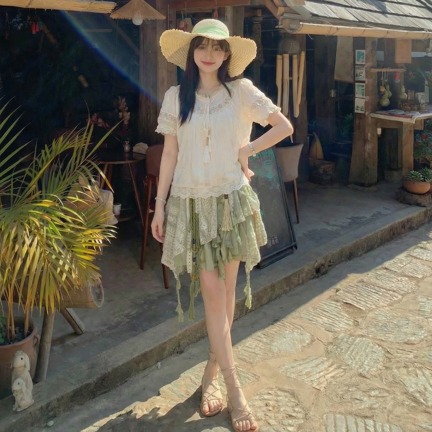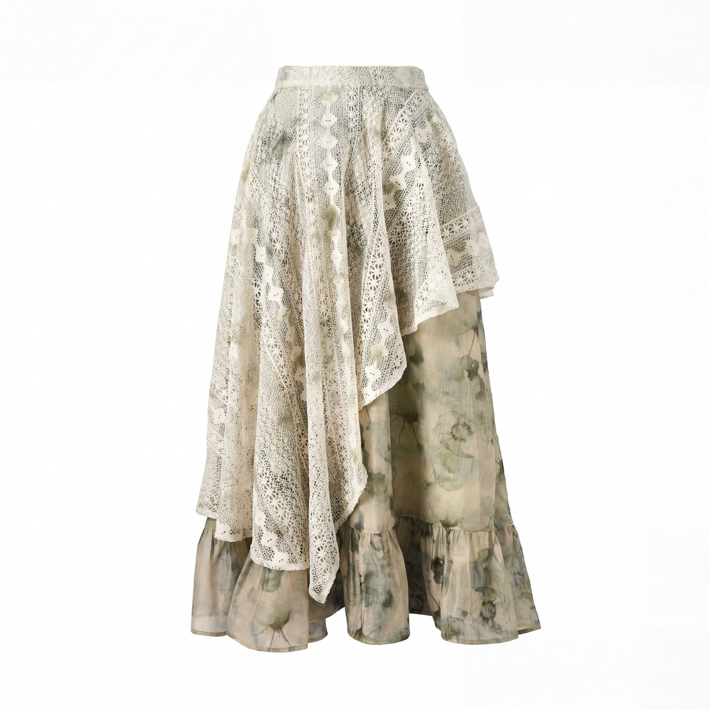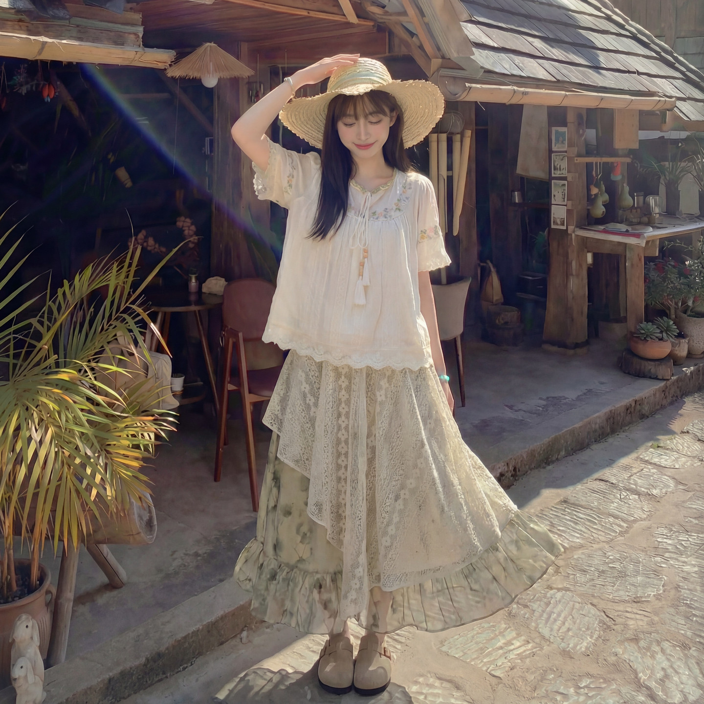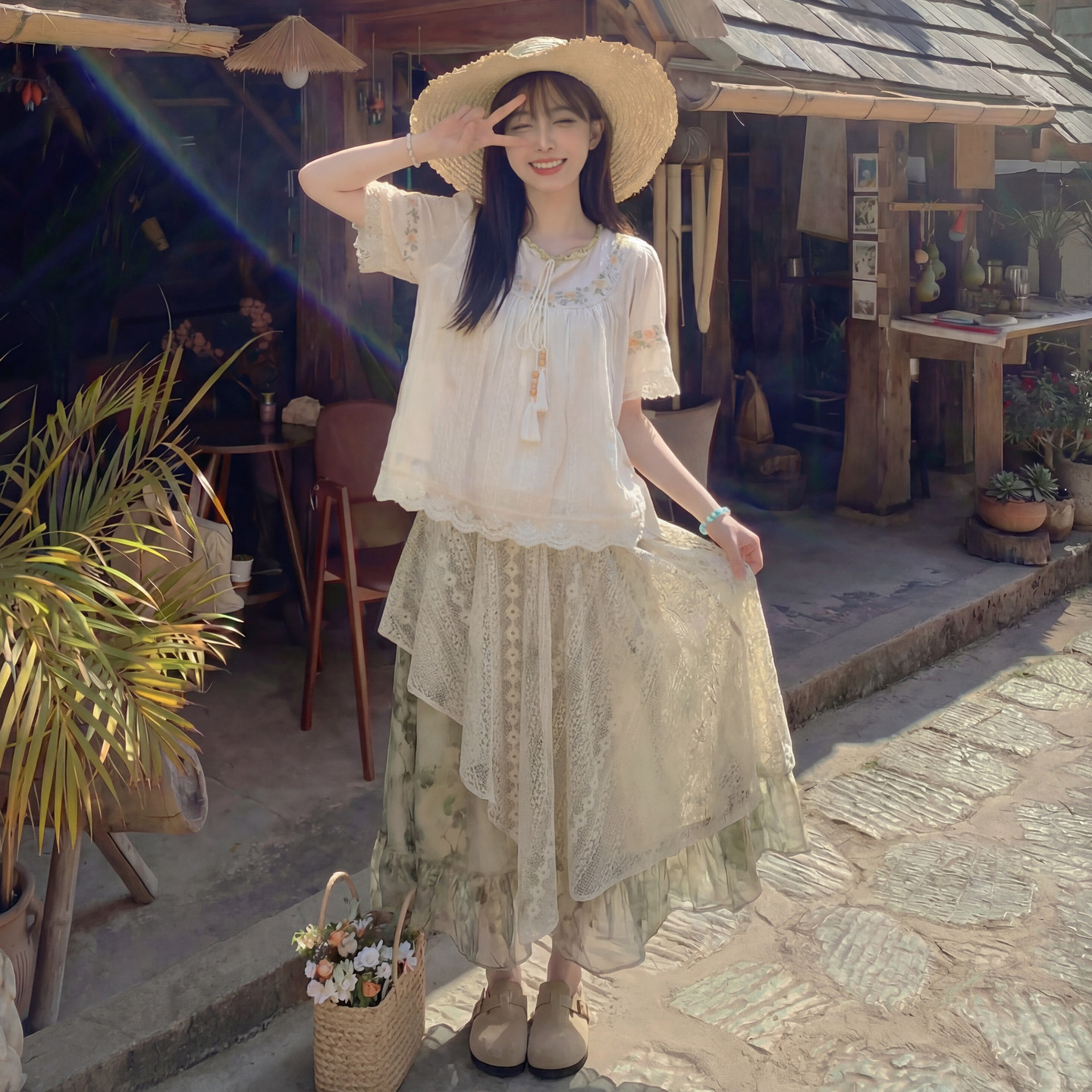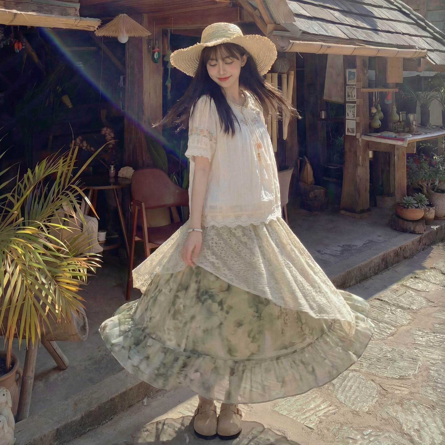 📚 森女部落波西米亚度假风蕾丝拼接设计感高腰半身裙女新款百搭长裙