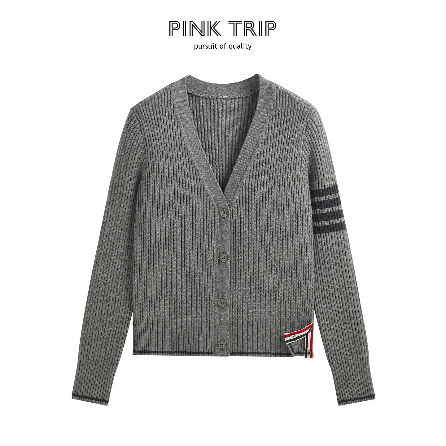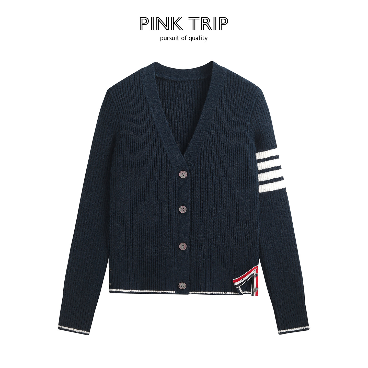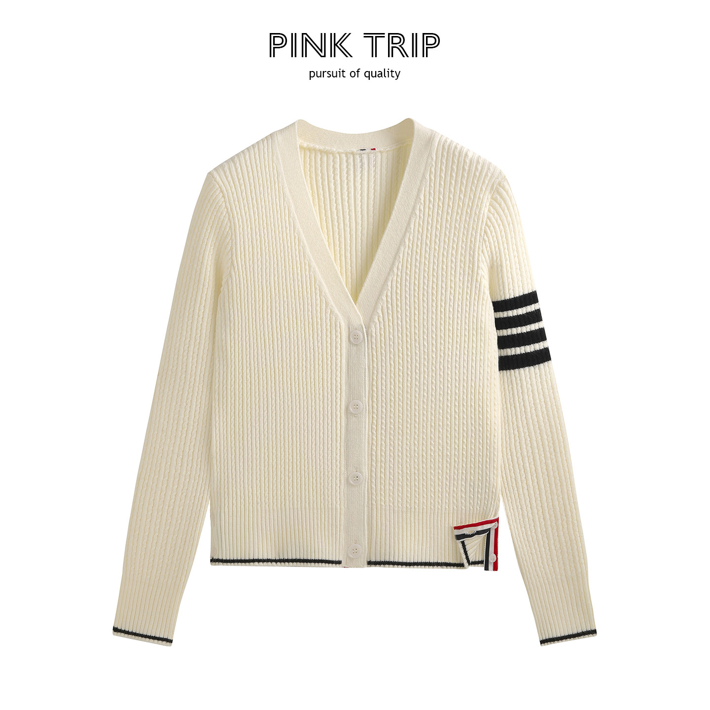 📚 Pink Trip四条杠扭花修身毛衣外套女秋冬v领细麻花tb针织开衫上衣
