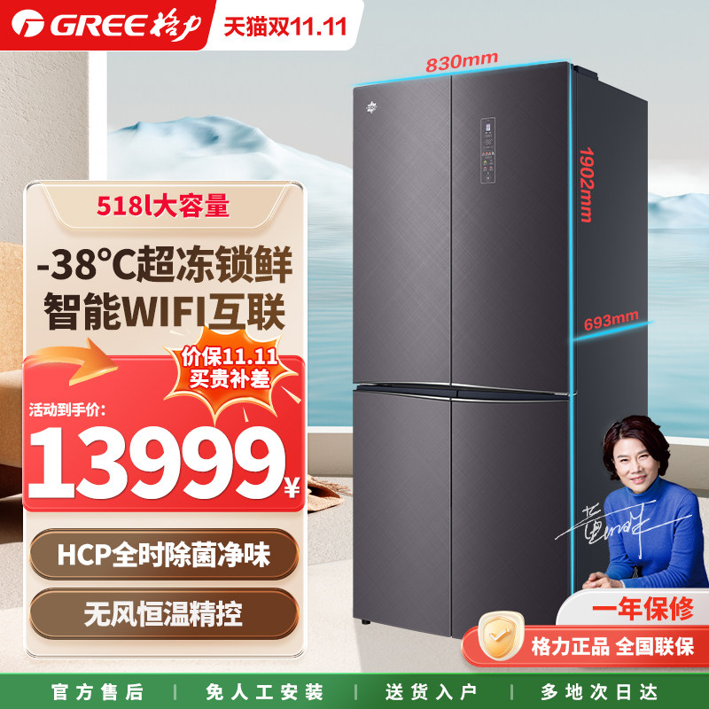 📚 格力晶弘冰箱518升四开门十字对开家用除菌净味节能变频一级能效