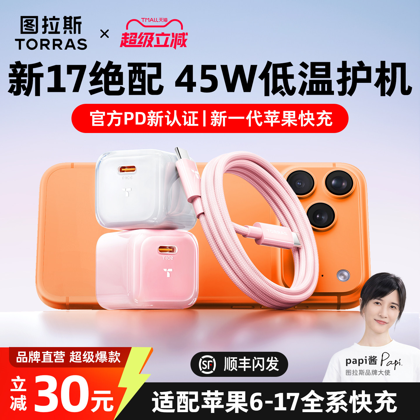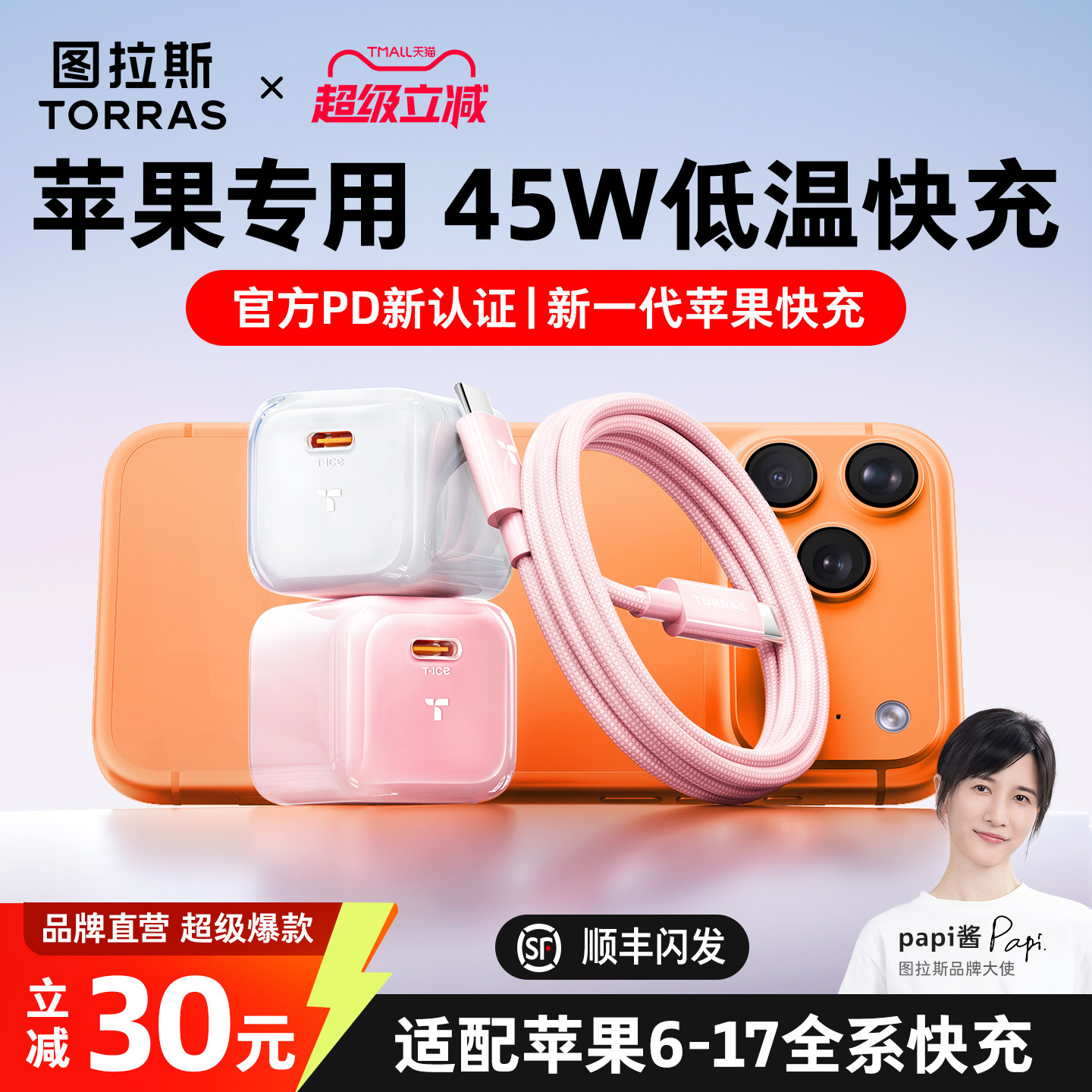 📚 【papi酱同款】图拉斯小冰块lite新款45W适用苹果充电器线iPhone17ProMax手机Air正品16快充头一套40W数据线