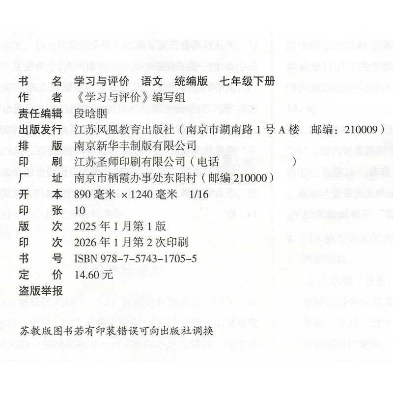 📚 2026年春 学习与评价 初中语文七年级7年级下册 部编版 配人教版教材 含参考答案 江苏凤凰教育出版社 XGX