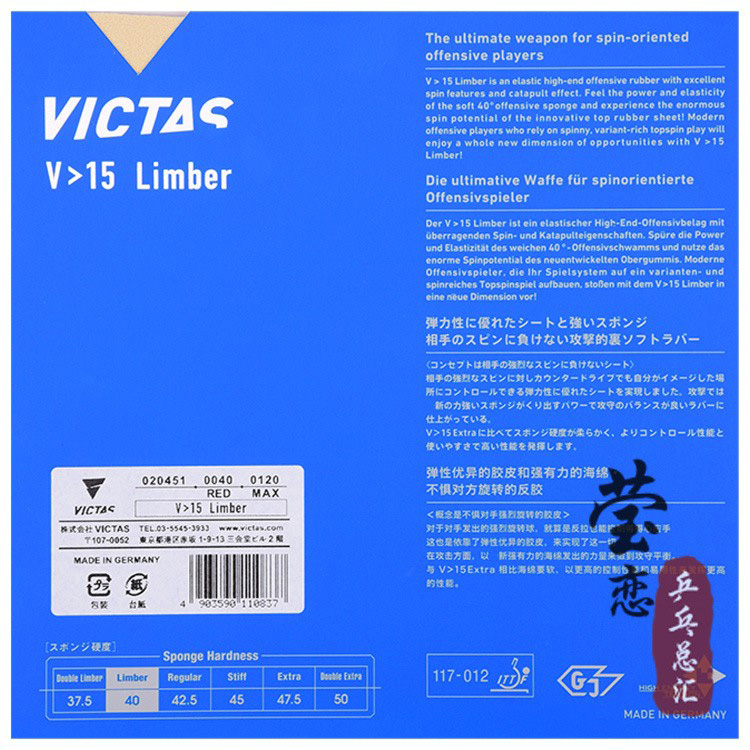 📚 莹恋 VICTAS乒乓球胶皮球拍反胶V15内能套胶丹羽孝希Limber Extra