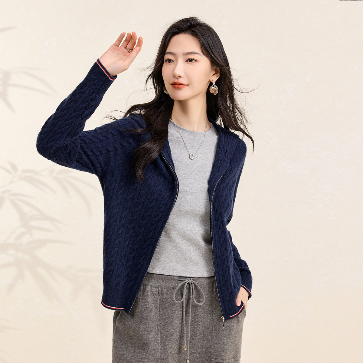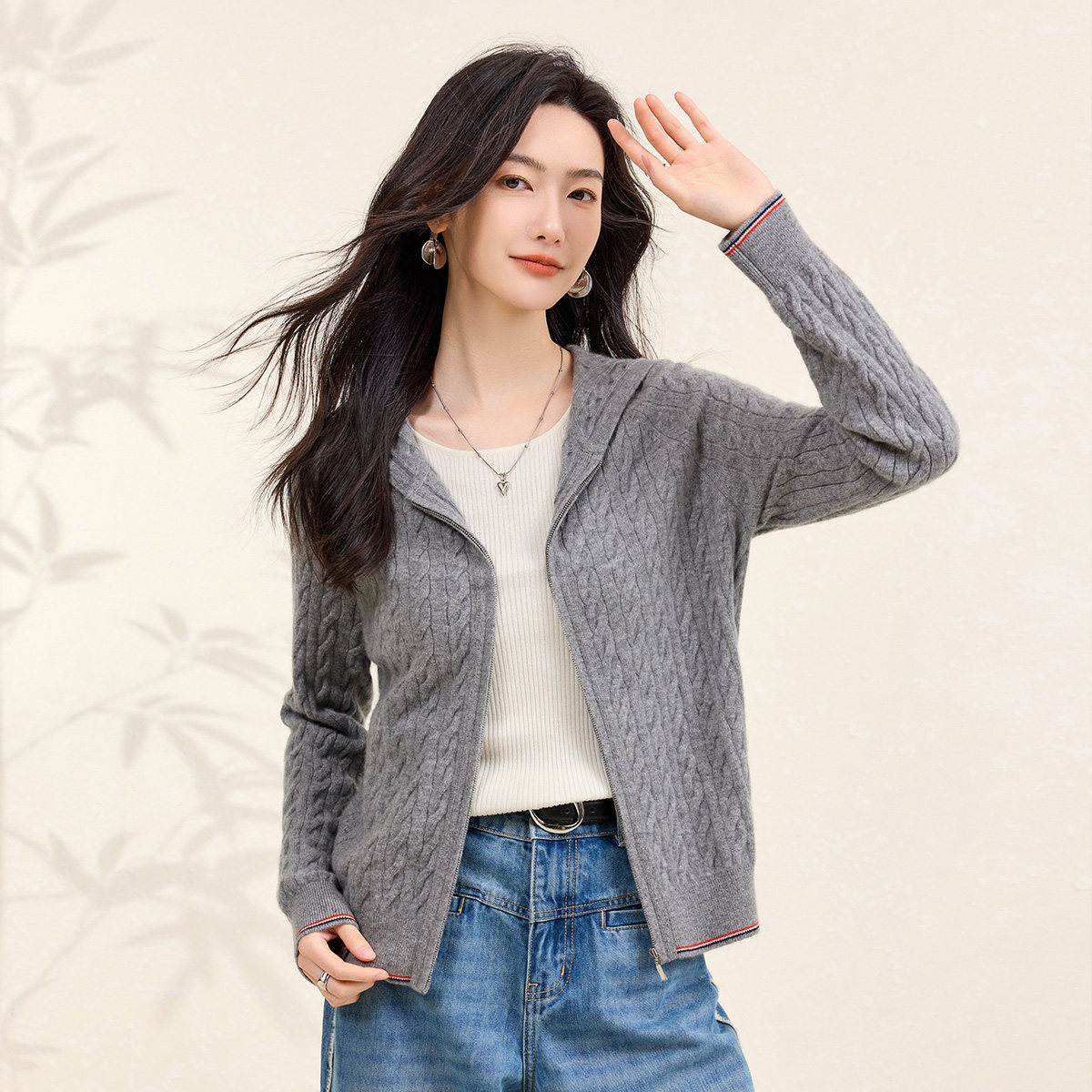 📚 【100%山羊绒】春竹25秋冬连帽绞花拉链厚款保暖毛衣女羊绒开衫