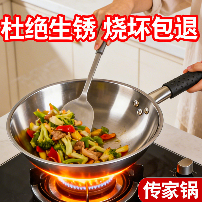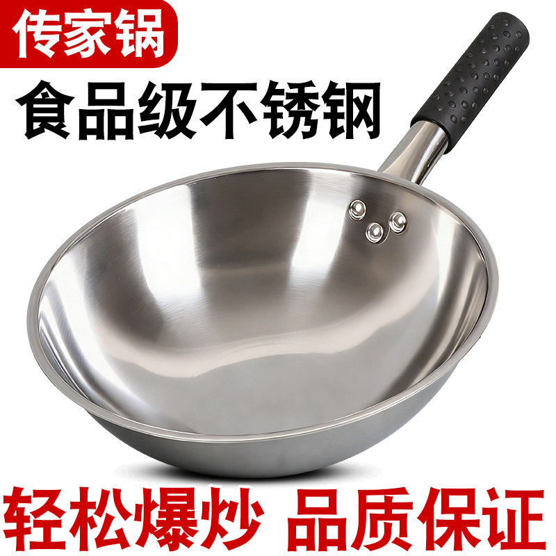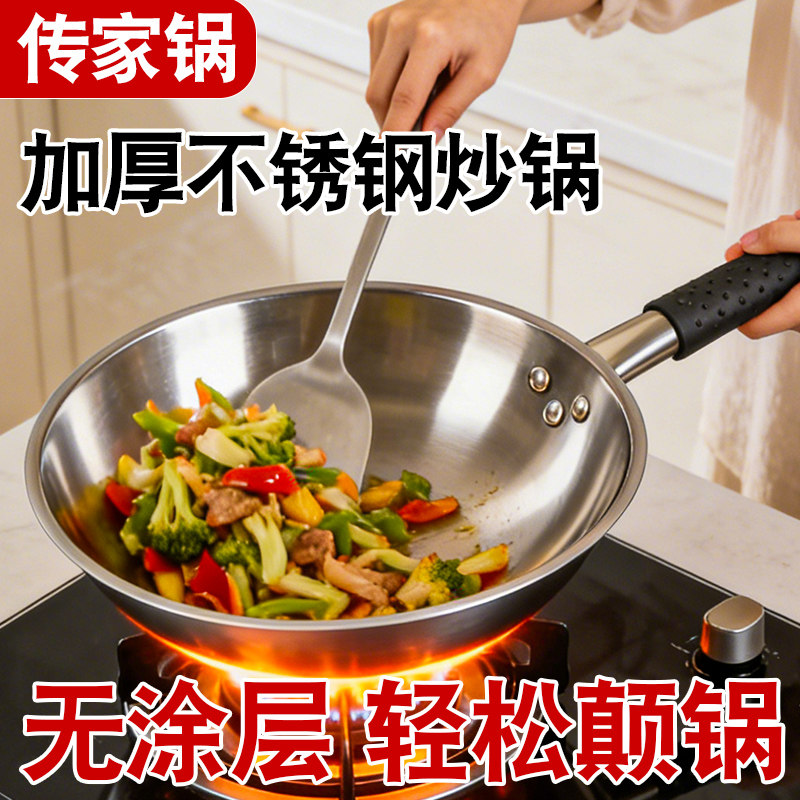 📚 瑞安不锈钢传家锅家用炒菜锅加厚圆底锅炒锅不粘锅燃气煤气灶专用