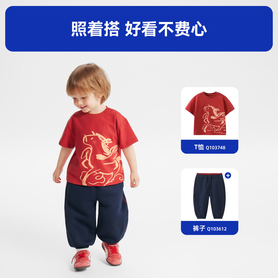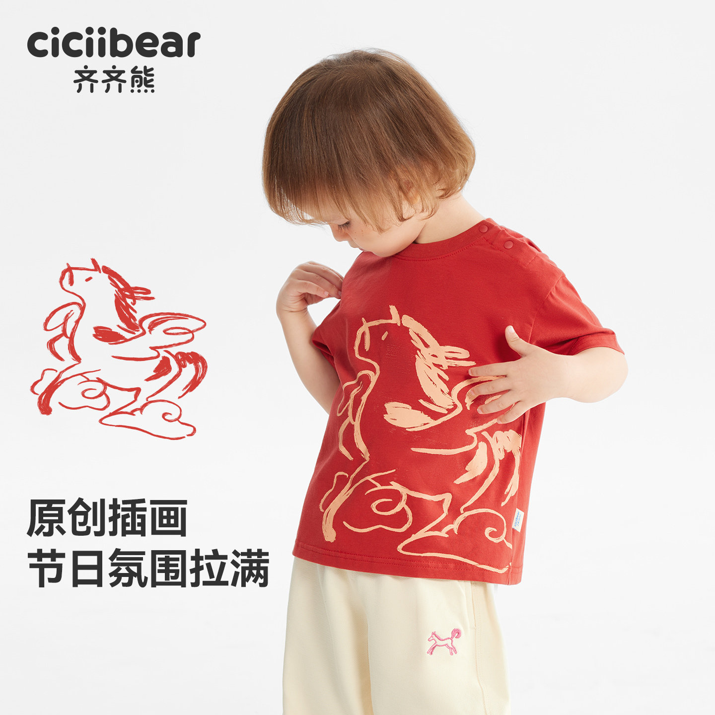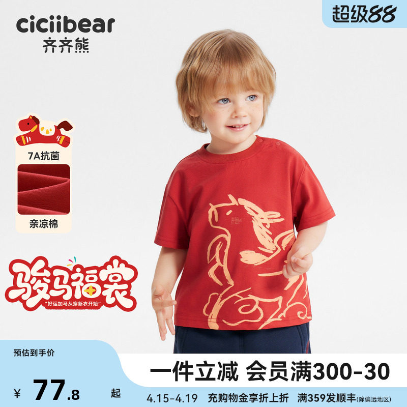📚 [骏马福裳]齐齐熊宝宝t恤短袖红色新年男童儿童装拜年服马年亲子