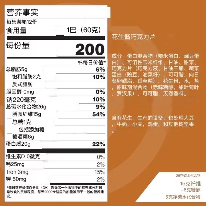📚 美国直邮 No Cow High Protein Bars 高纤维营养素食蛋白棒 12支