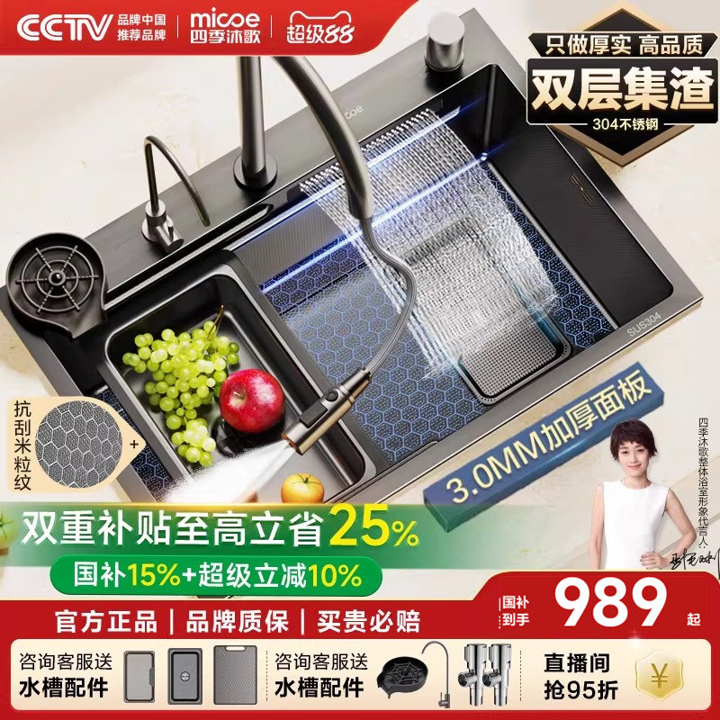 📚 四季沐歌厨房水槽洗菜盆飞瀑瀑布集渣过滤大单槽推荐选包安装拆旧