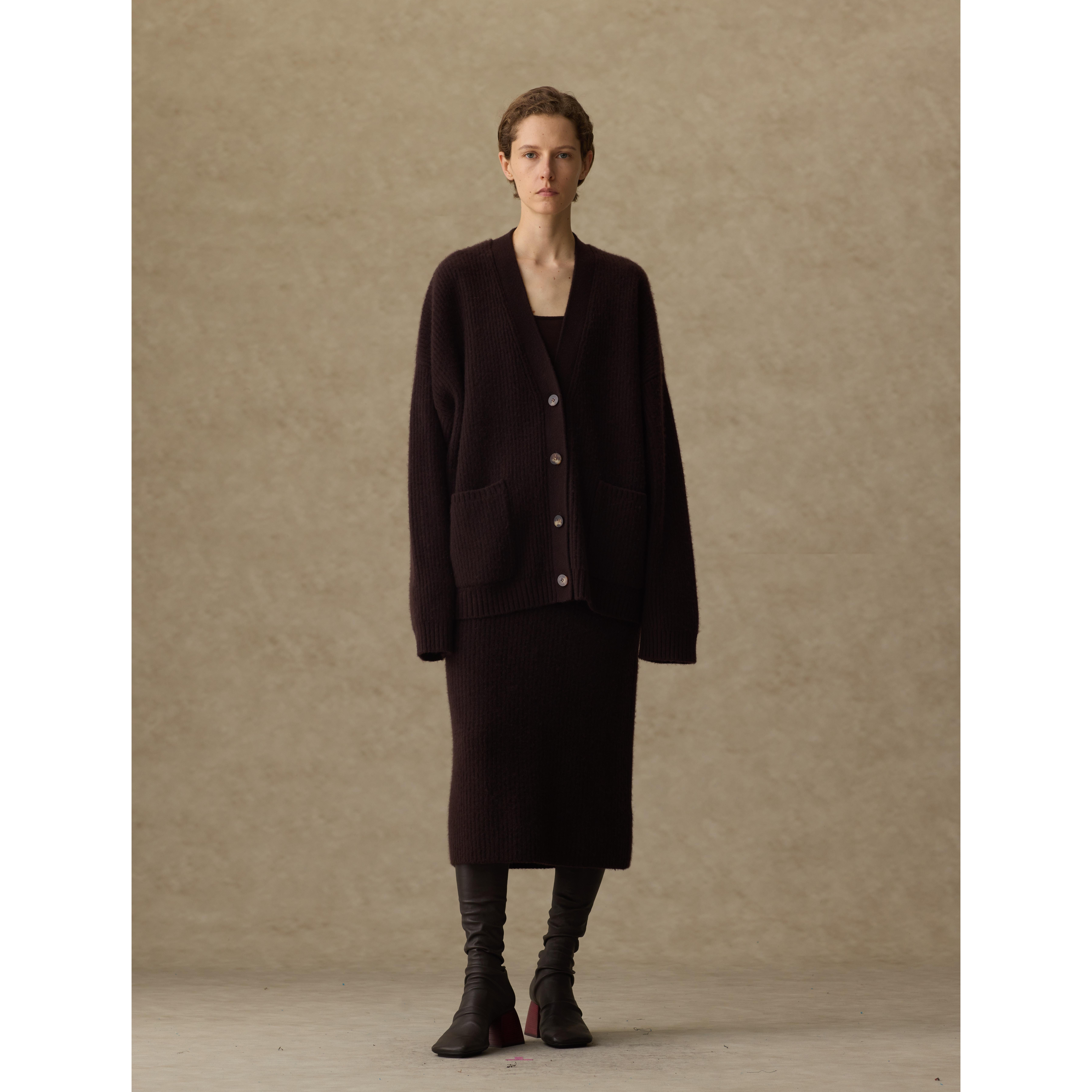 📚 1436 x UMA WANG 山羊绒乌木棕粗纺V领双畦缩绒针织秋冬系扣开衫