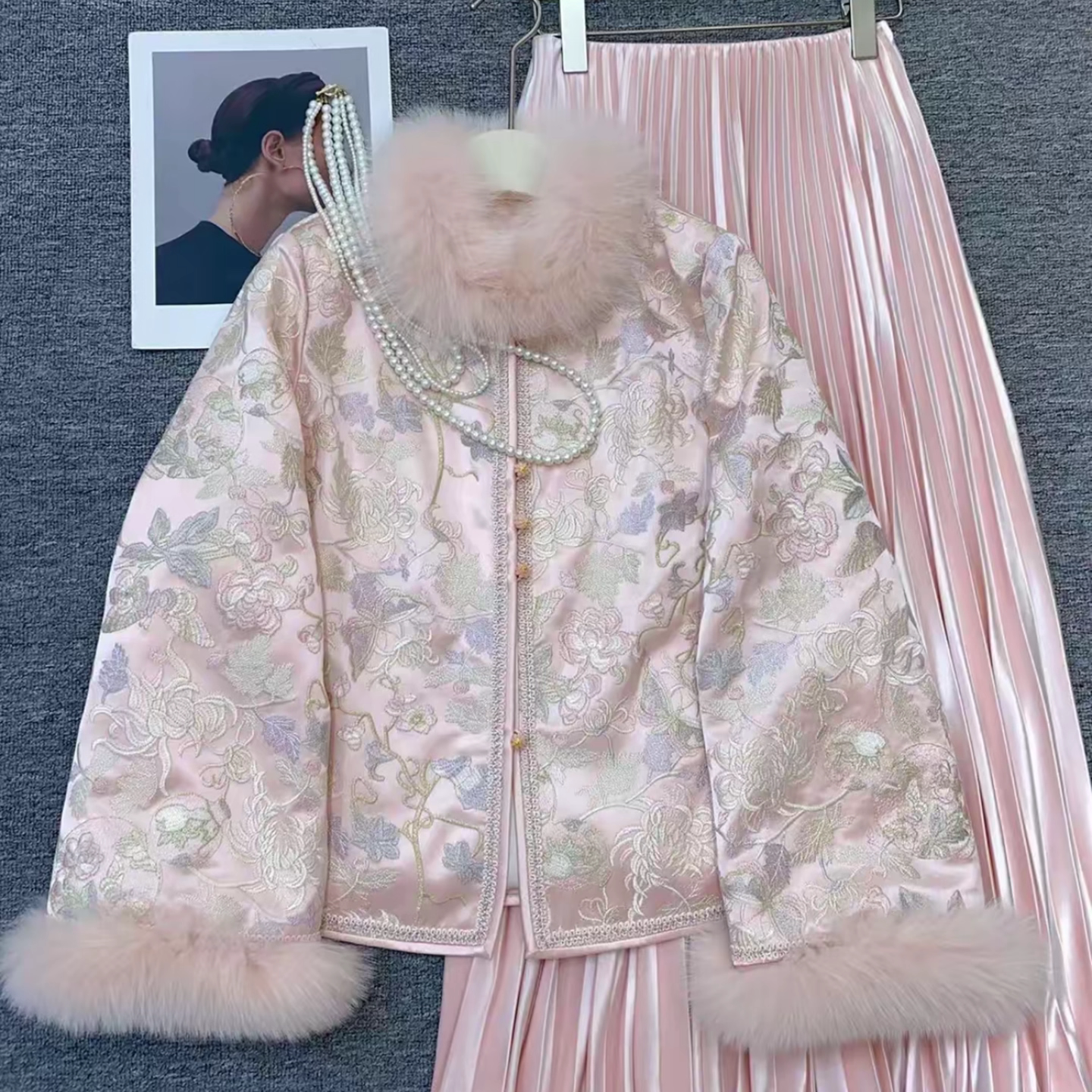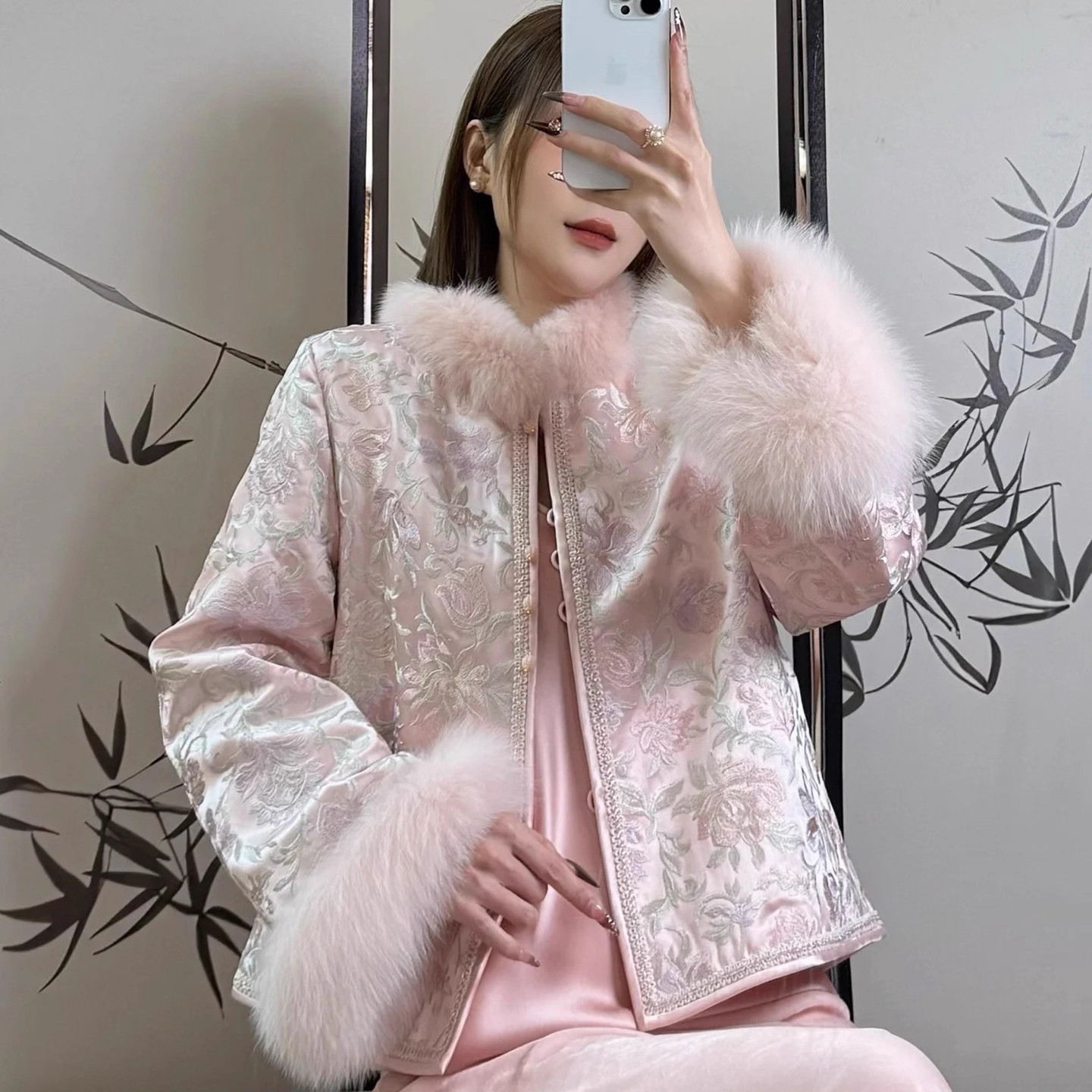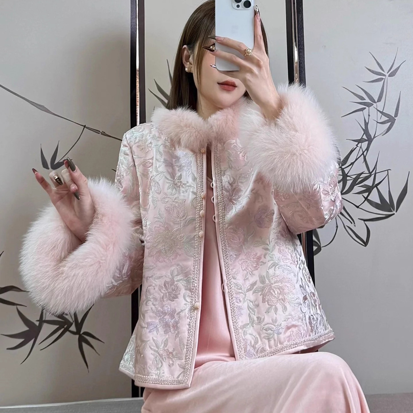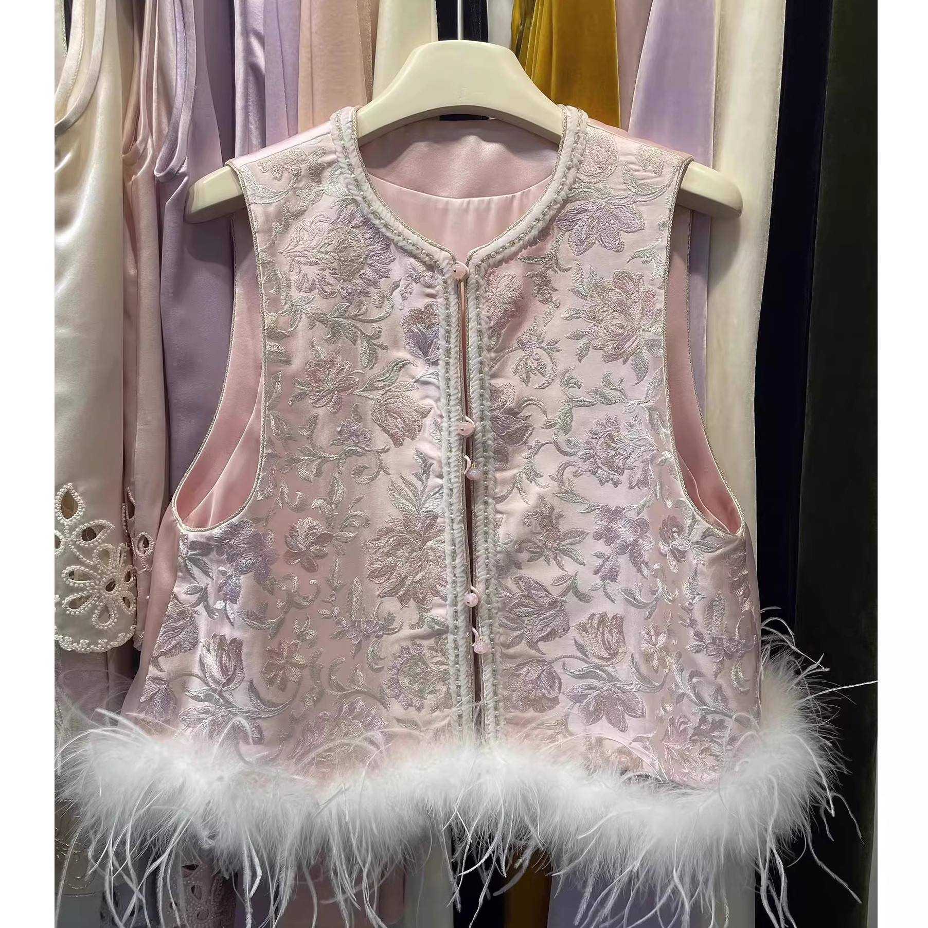 📚 新中式醋酸刺绣马甲狐狸毛外套女 2025冬季驼鸟毛坎肩马夹上衣