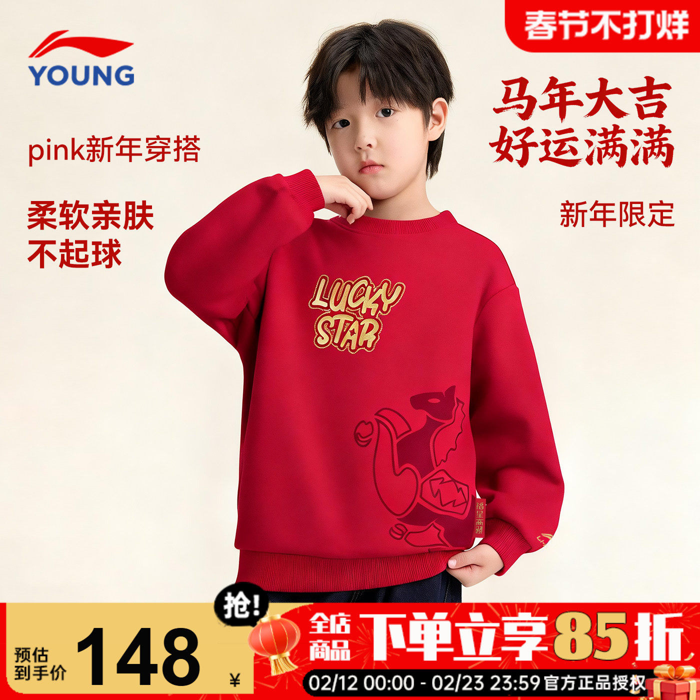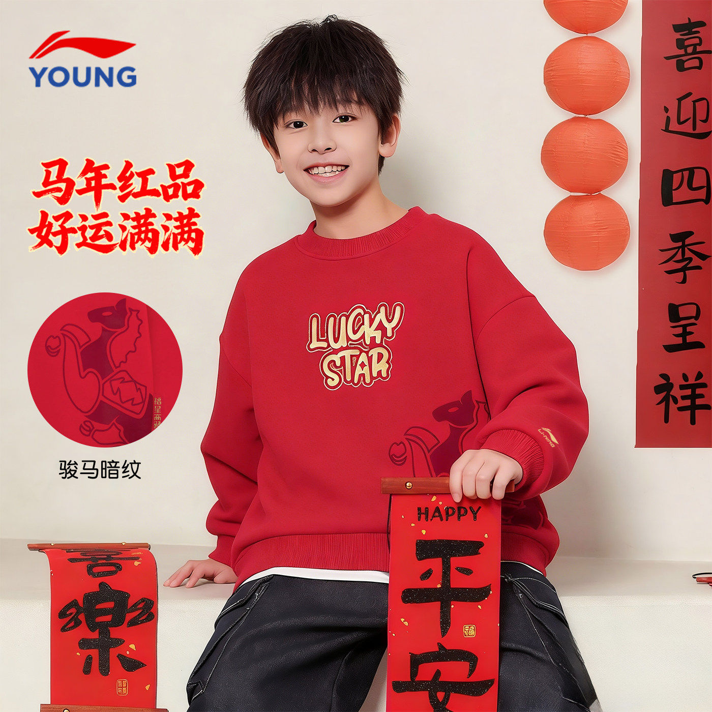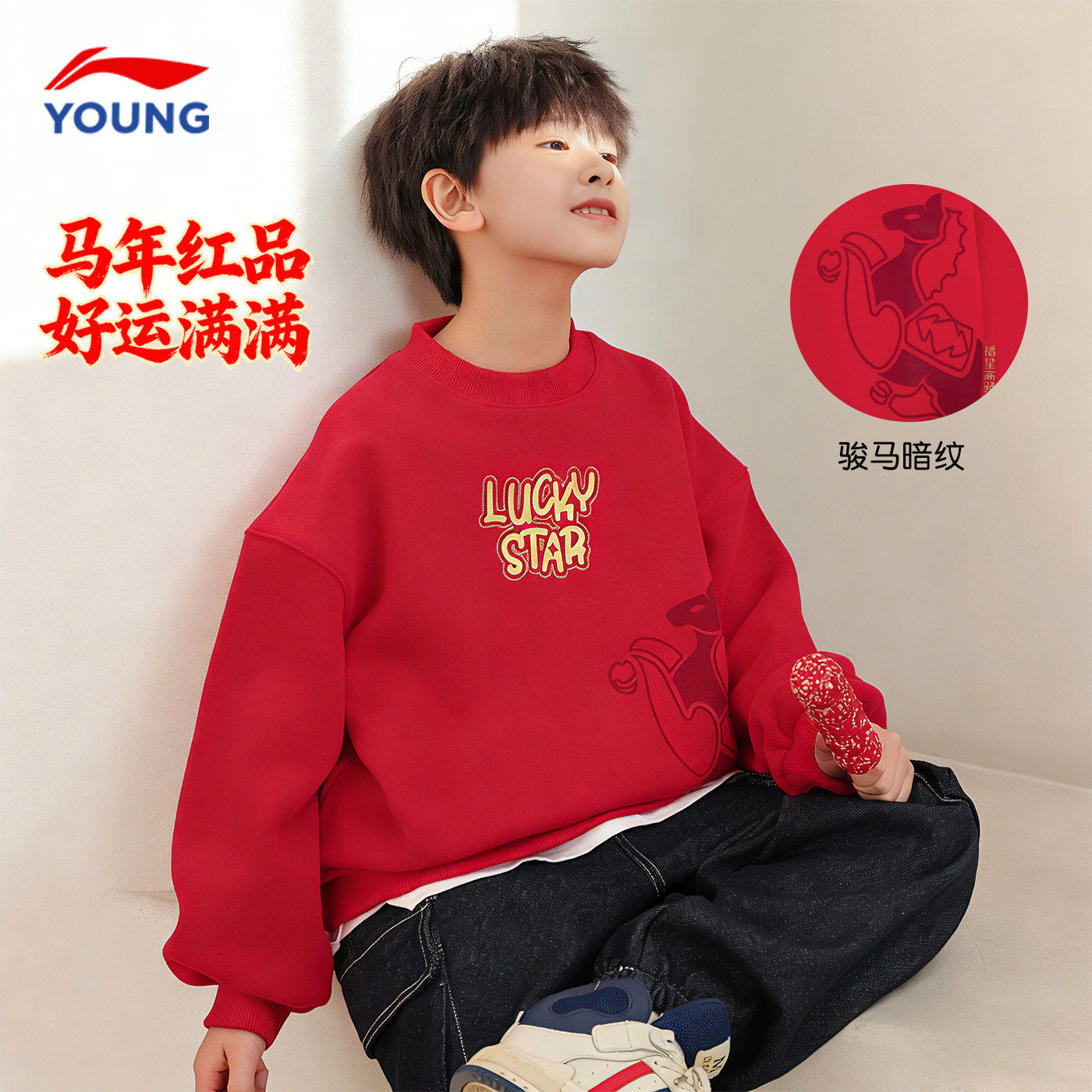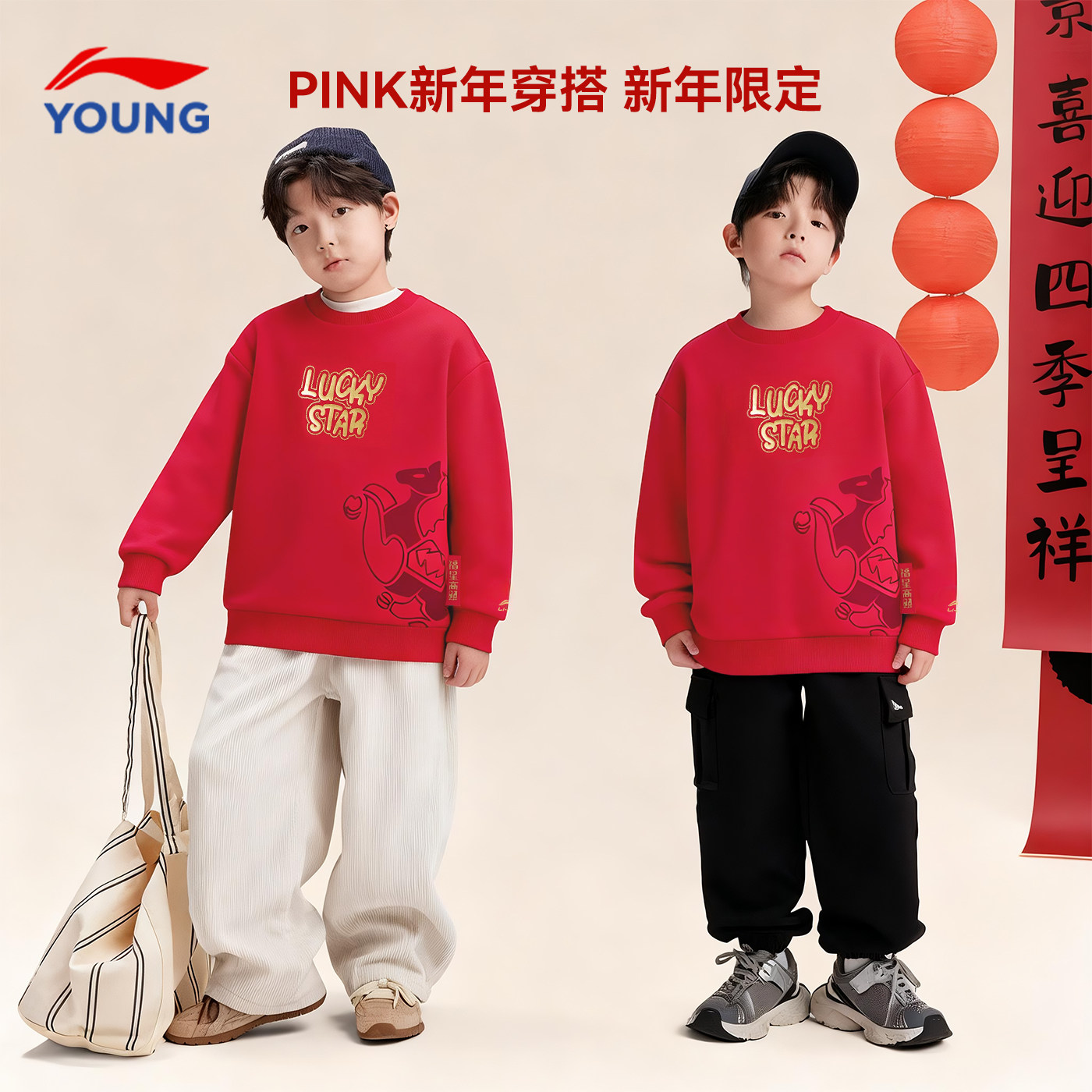 📚 商场同款|李宁儿童红色卫衣男童本命年新年衣服2026马年内搭上衣