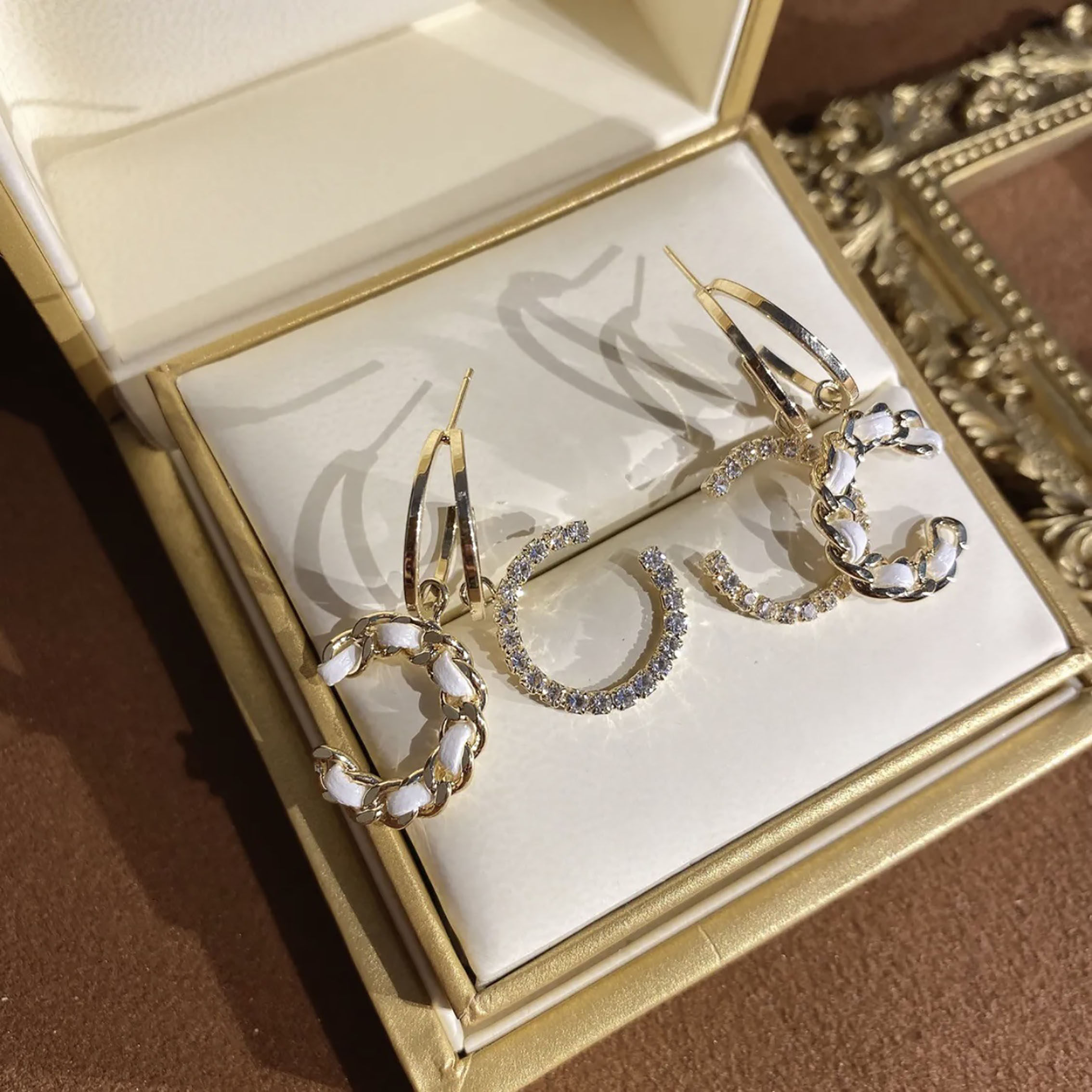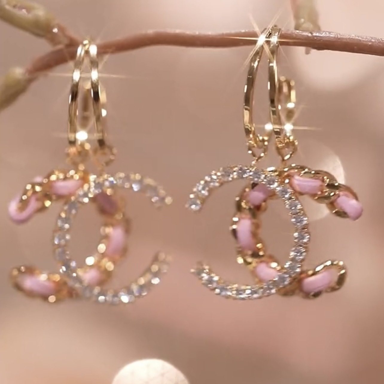 📚 新款粉色双C型耳环925银针皮镶钻防过敏不掉色耳钉高级感轻奢气质