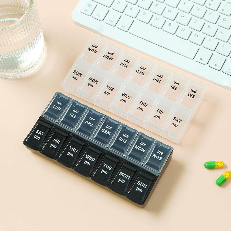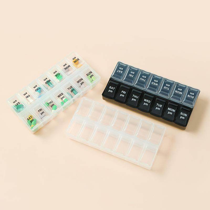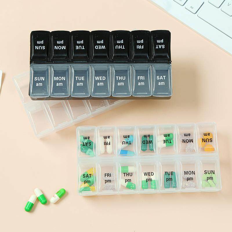 📚 外贸小号便携式药盒每周7天早晚药片盒14格双排分装小药盒定制