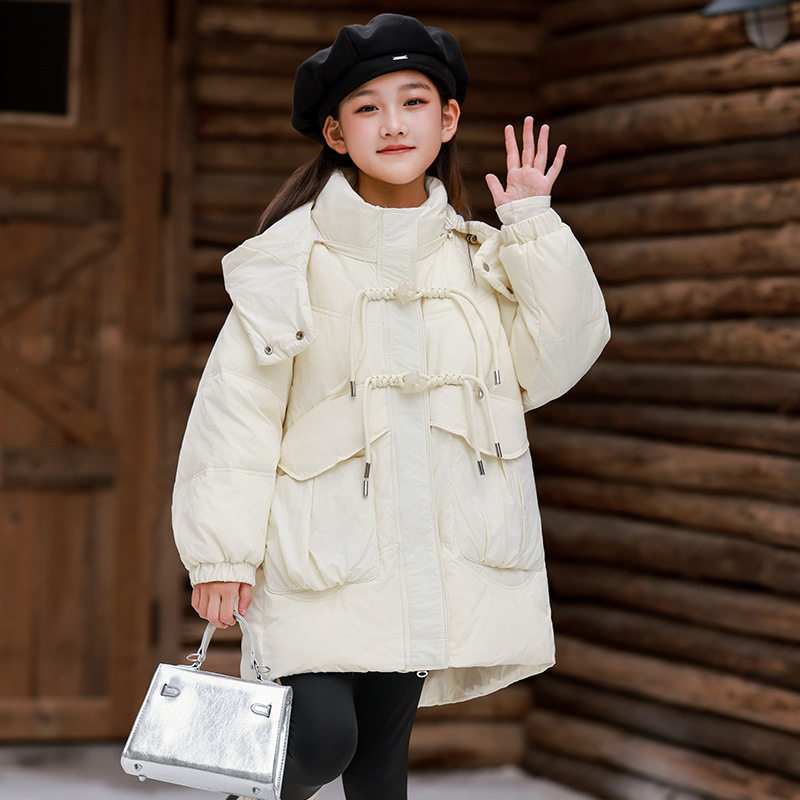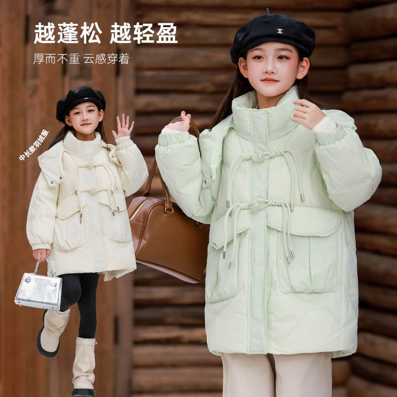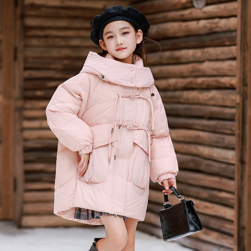 📚 女童公主中长款宽松羽绒服加厚绿粉黄色外套大童连帽棉袄衣棉服冬