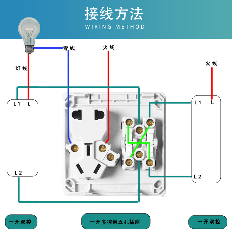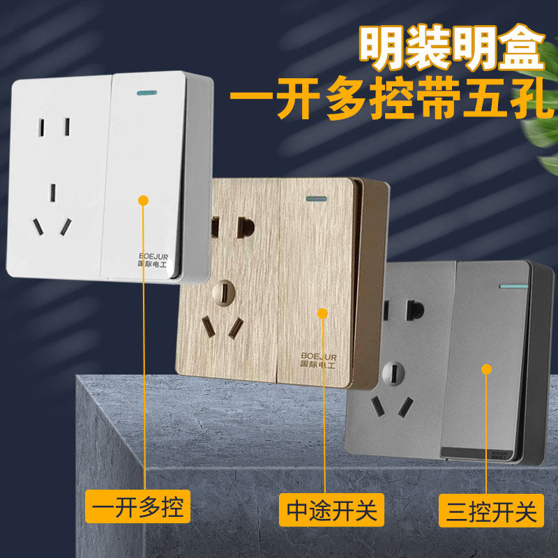 📚 明装一开多控带五孔插座开关床头三控中途开关5孔插座家用大功率