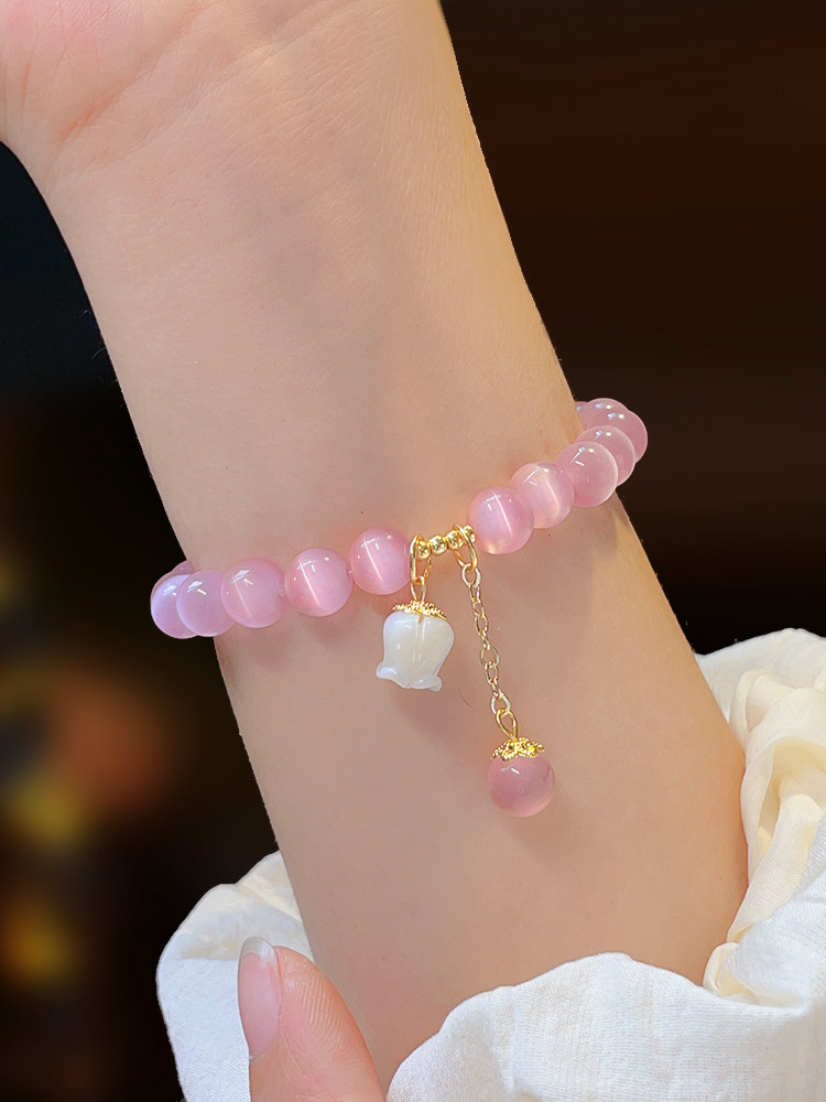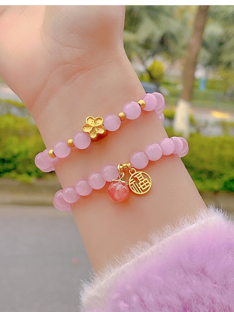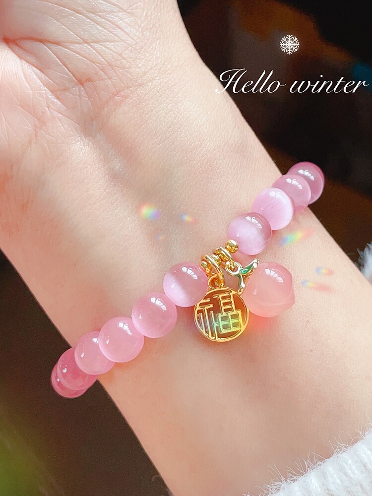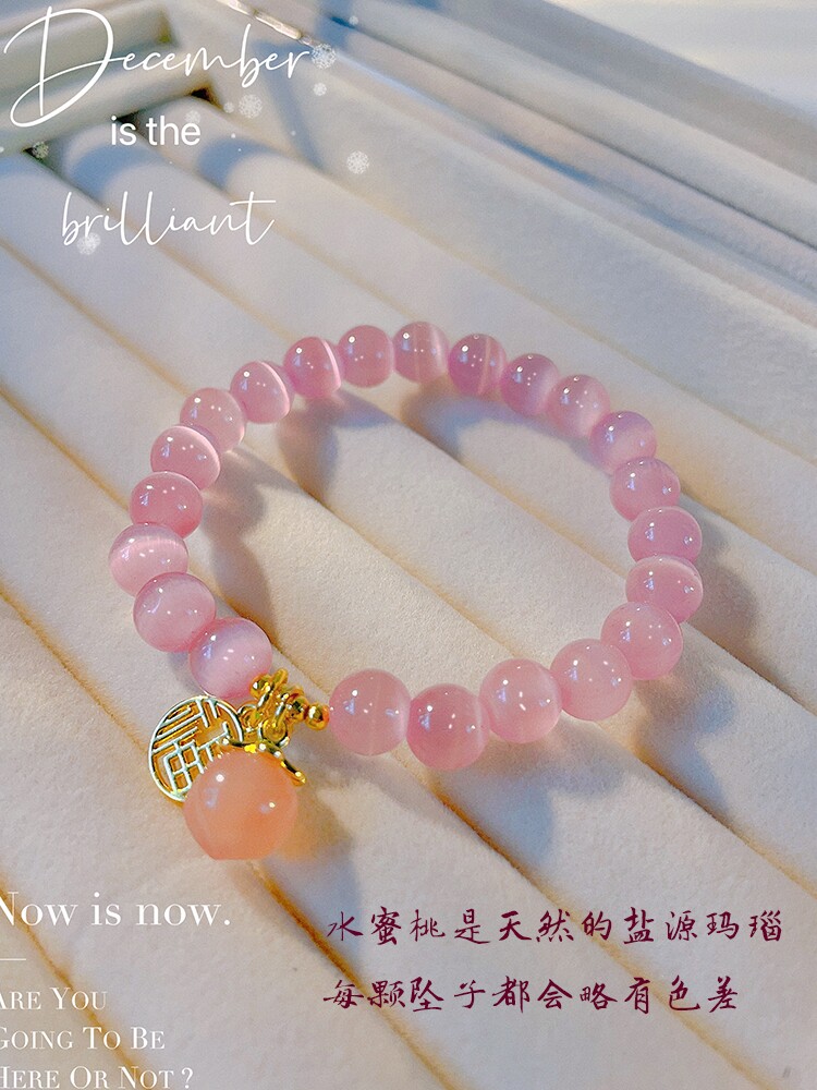 📚 粉猫眼石水晶手链女盐源玛瑙水蜜桃福牌手串轻奢小众设计学生手饰