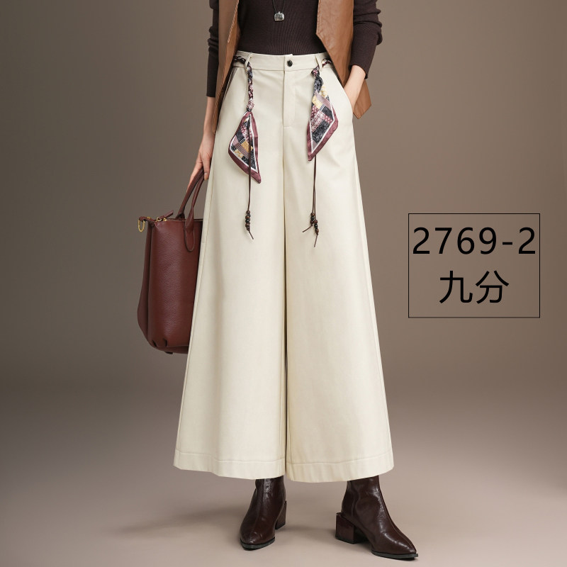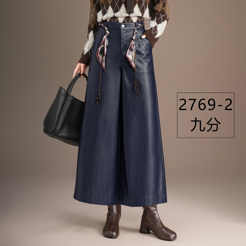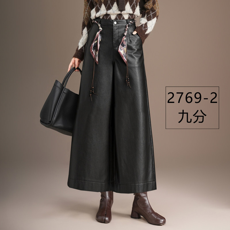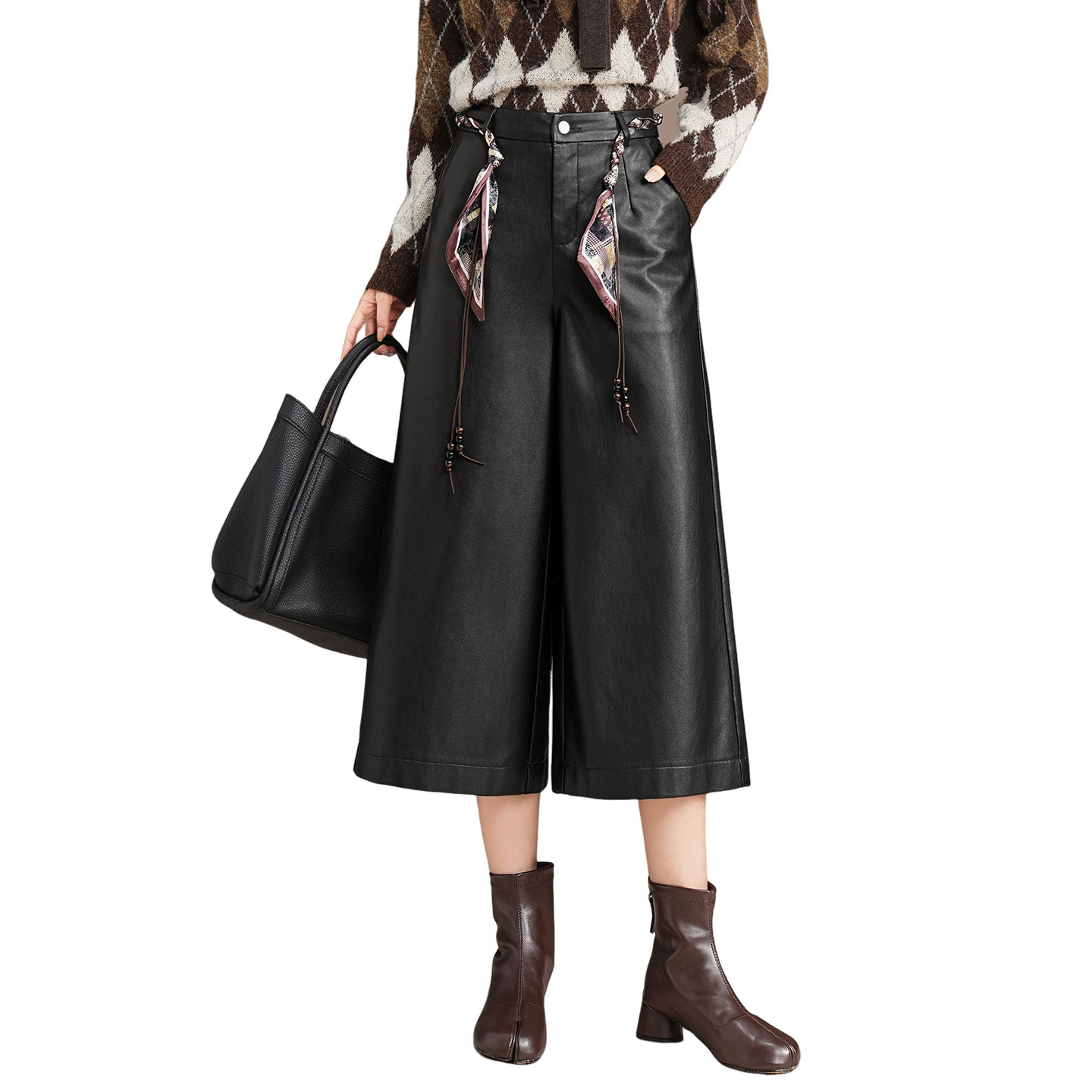 📚 海宁皮裤女九分阔腿裤绵羊皮休闲气质宽松裙裤春装新款八分靴裤子