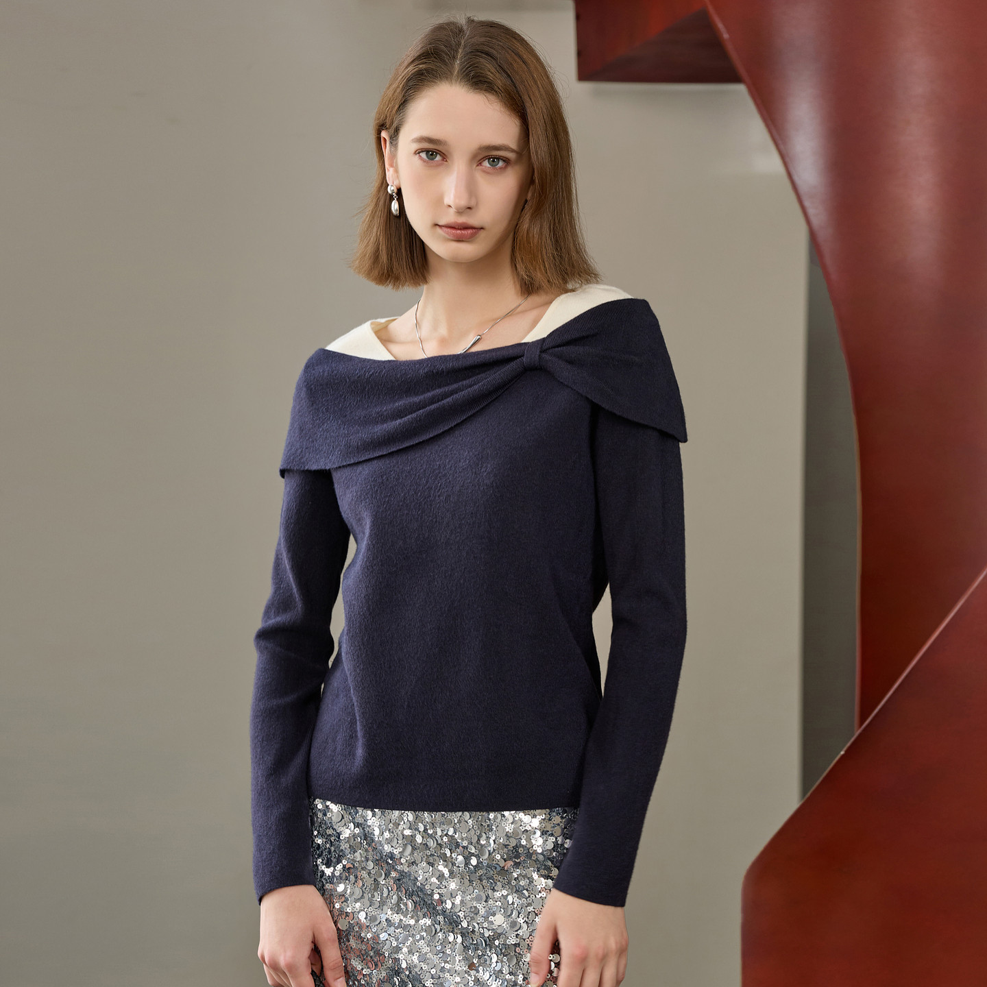 📚 丽雪leisure2025冬季新款蝴蝶结一字领针织衫长袖毛衫简约