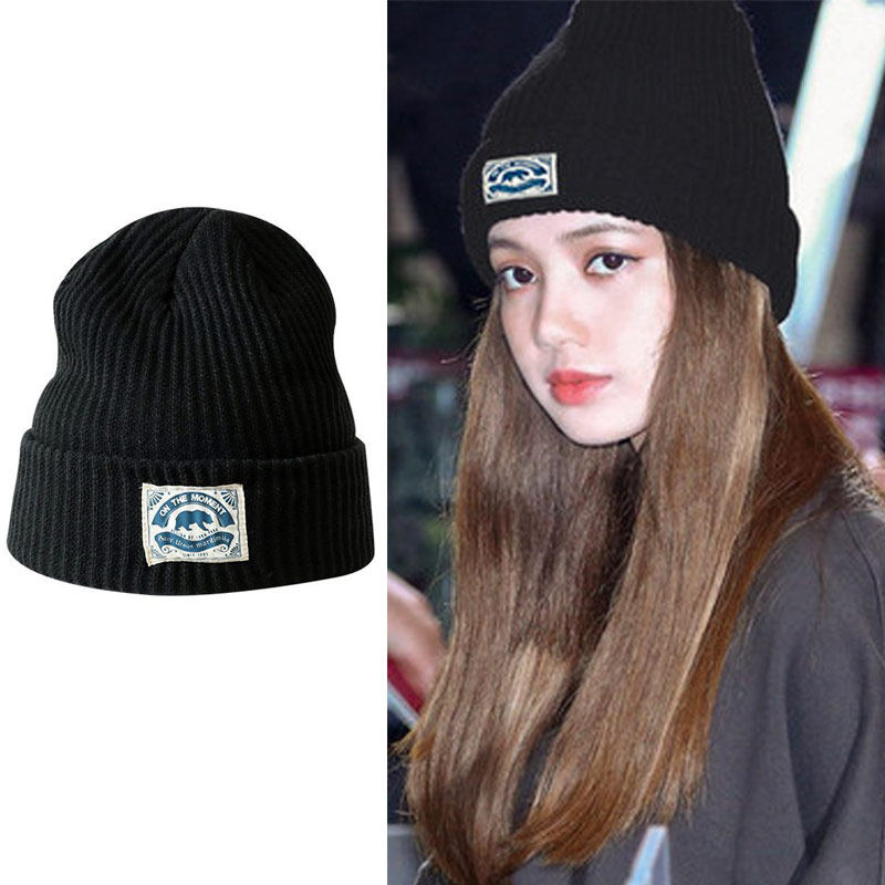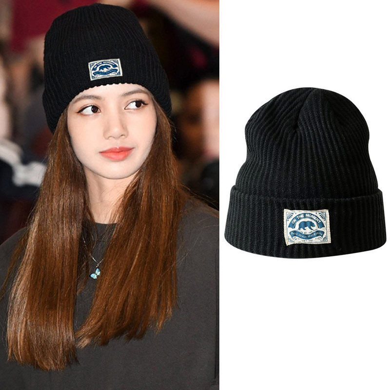 📚 blackpink Lisa同款黑色白标针织帽子卡通毛线百搭韩版户外套头帽
