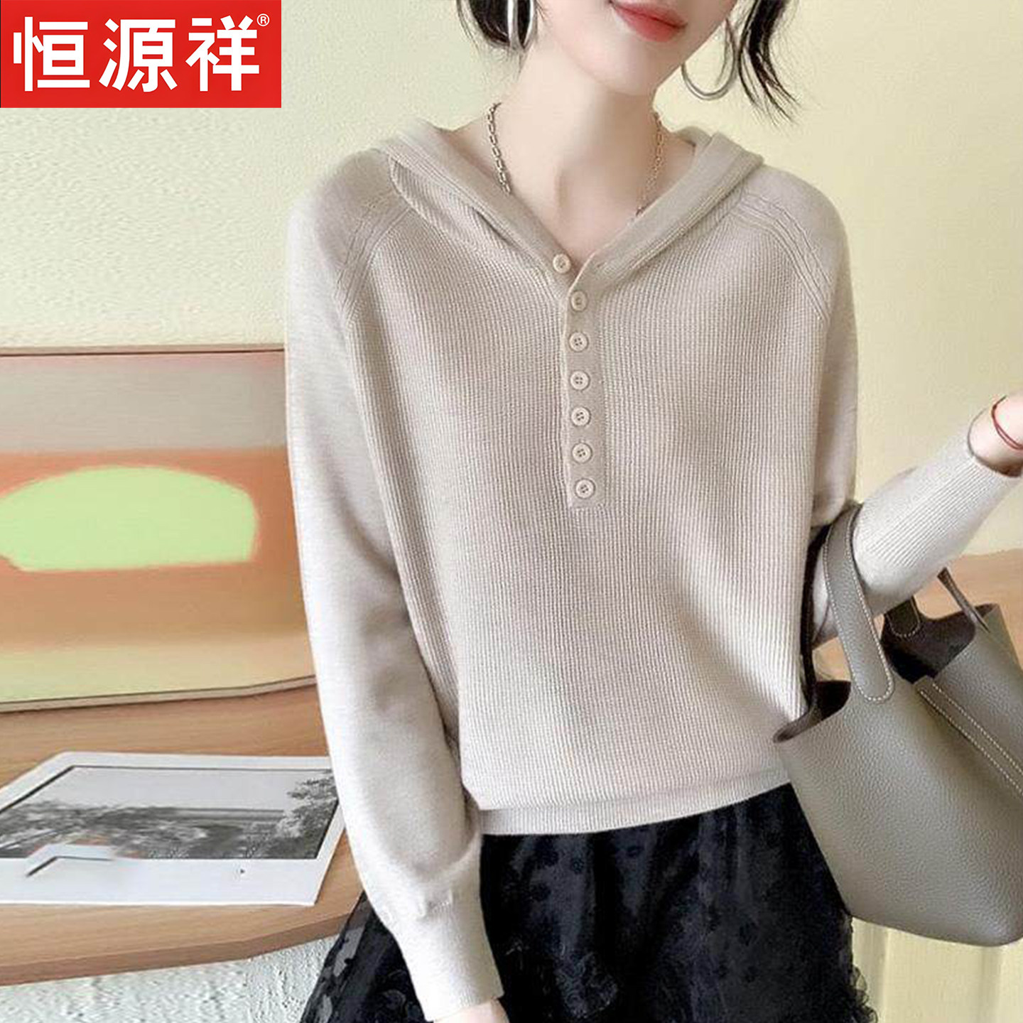 📚 恒源祥2026春秋连帽针织衫女绿色纽扣套头宽松百搭通勤长袖卫衣潮