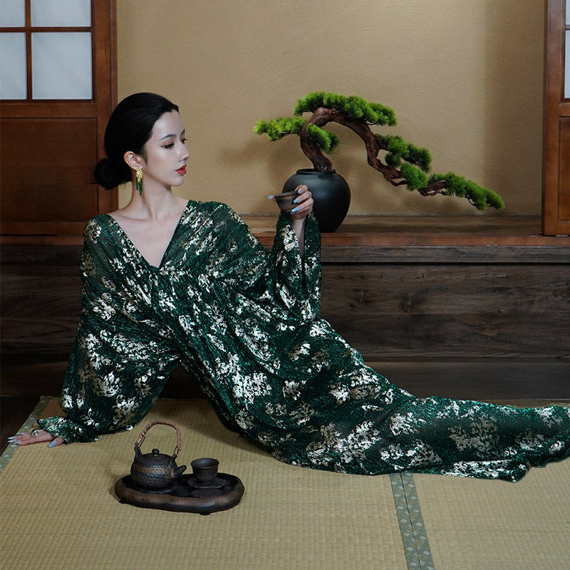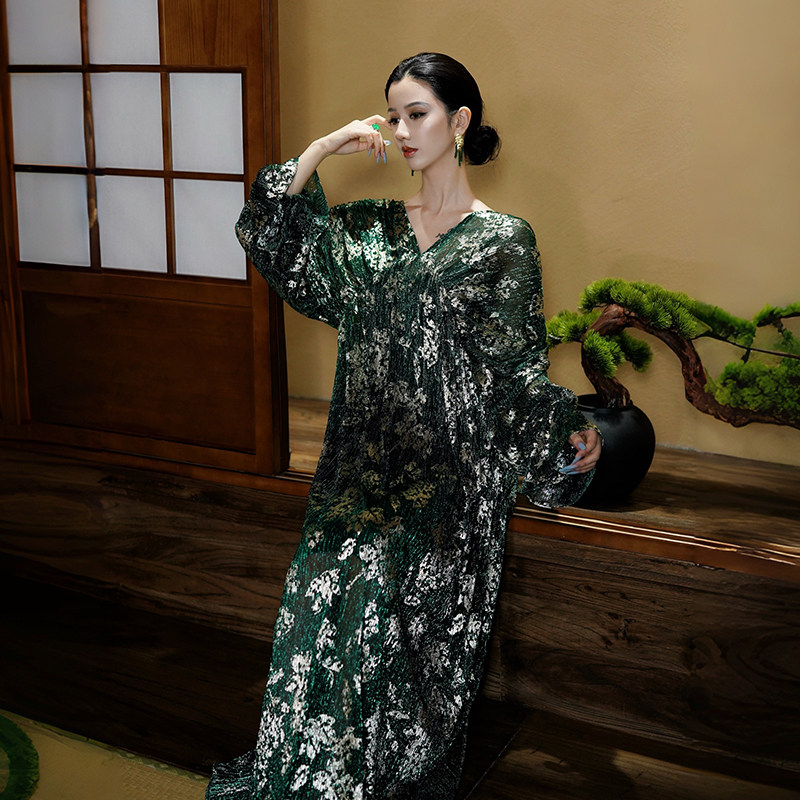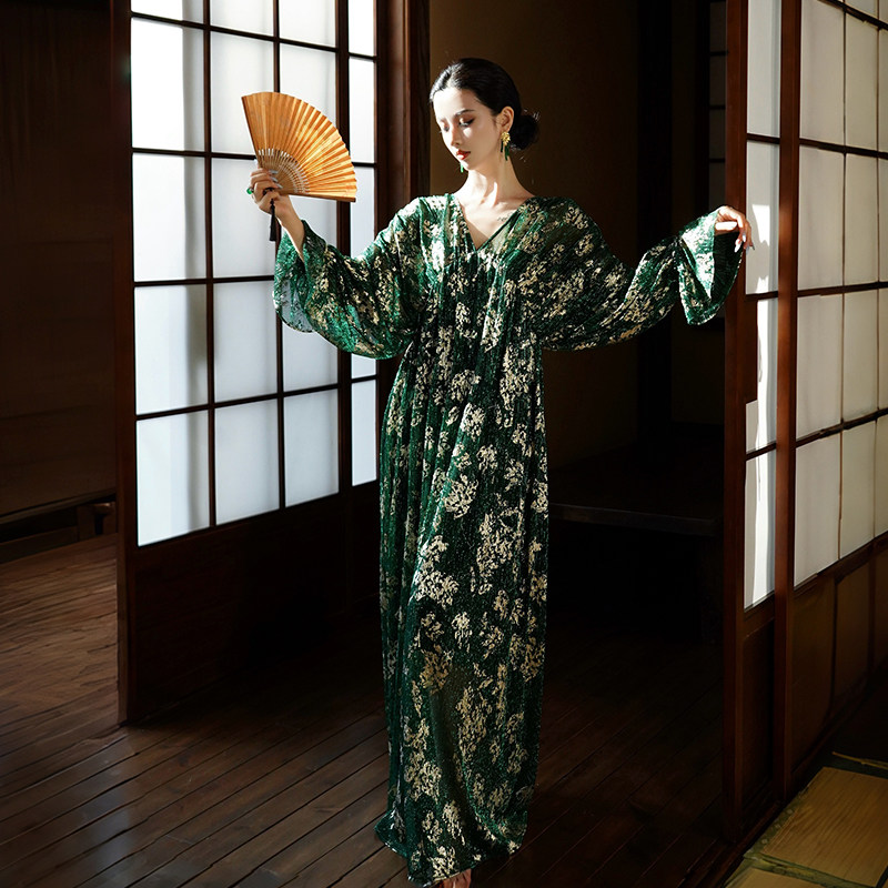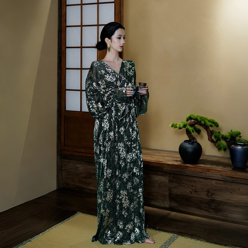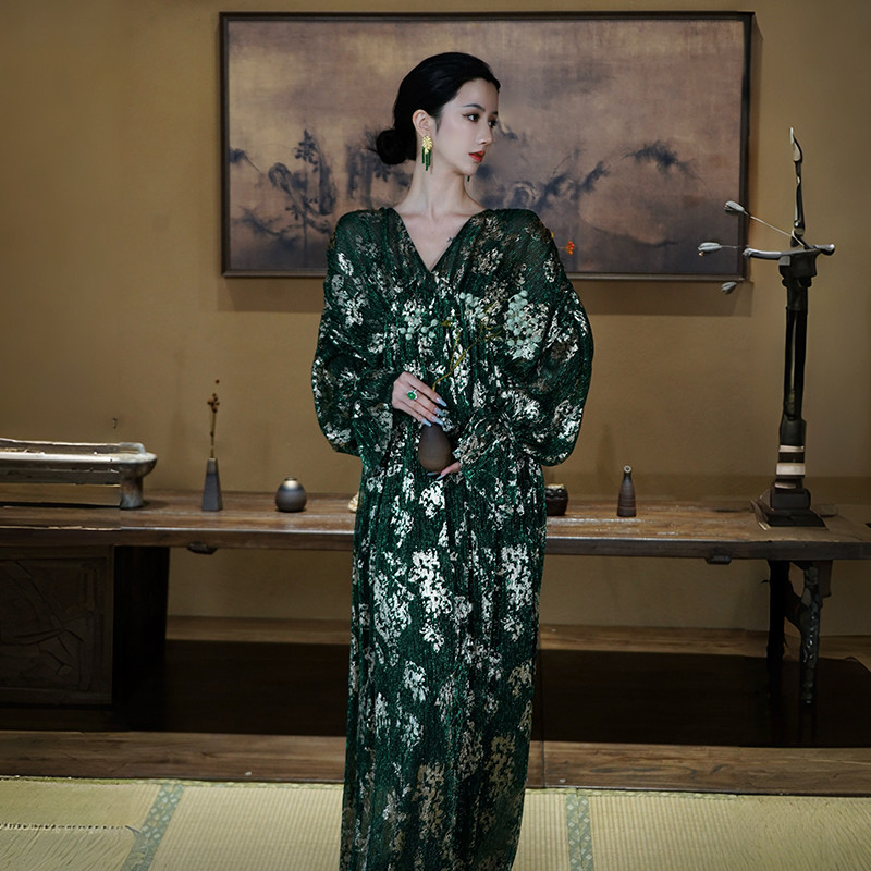 📚 澄渔高定【远山青鹭】新中式翡绿定织缂金纱绉玉石扣系带连衣裙