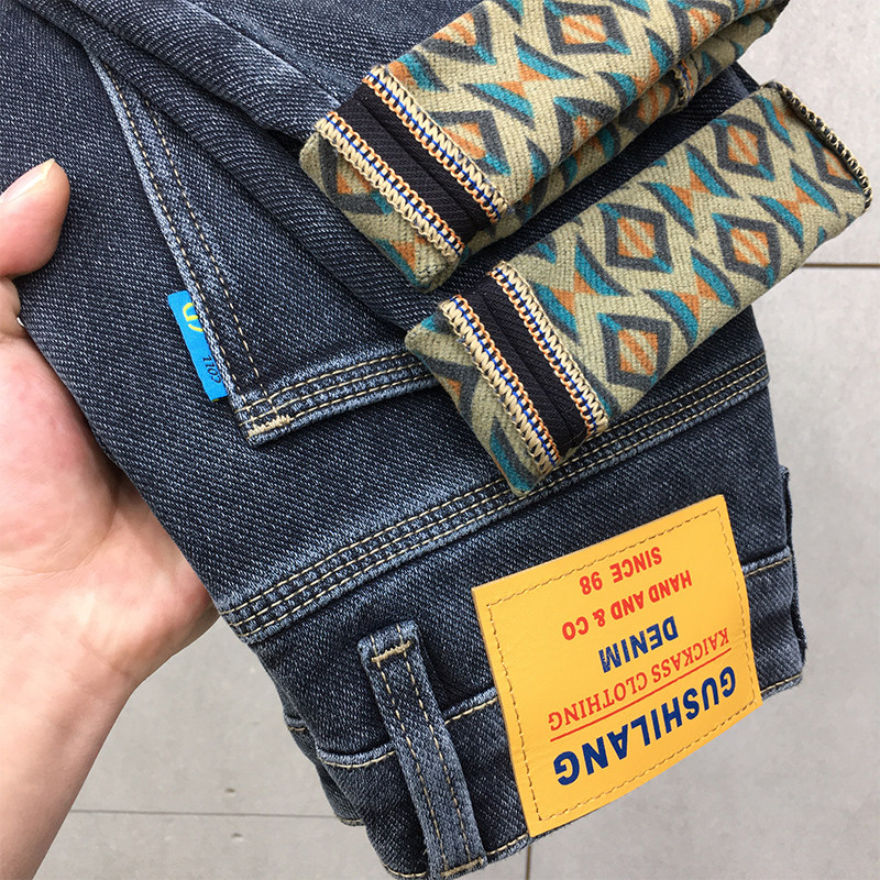 📚 保暖加绒牛仔裤男厚款印花高端抓绒修身小脚九分裤冬季厚款古士狼
