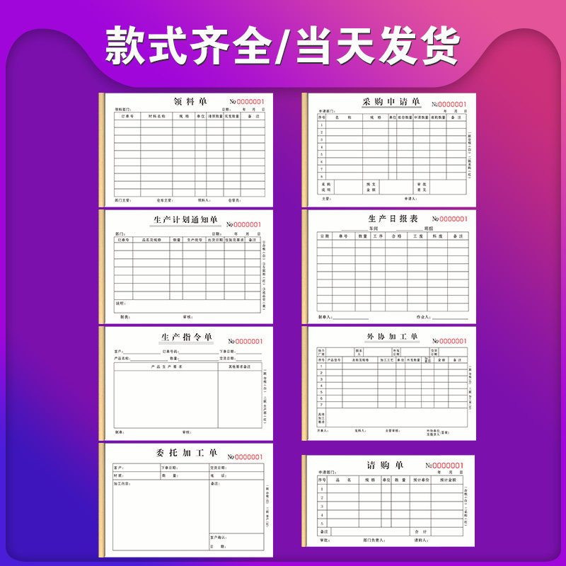 📚 领料单二联定做仓库生产日报表外协加工单四联物料委外加工任务指令登记本退料计划通知表物资材料领用单三联