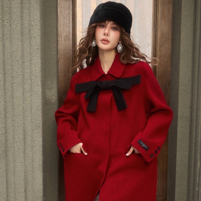 📚 CLOUDSEASON蝴蝶结长款红色外套气质羊毛大衣女春秋100%羊毛外套