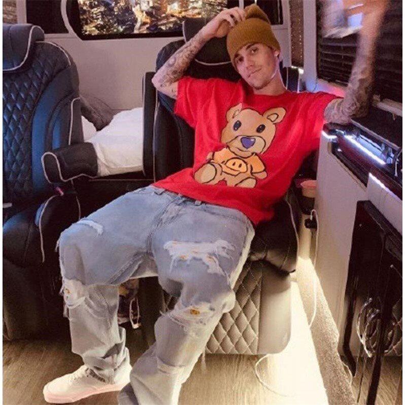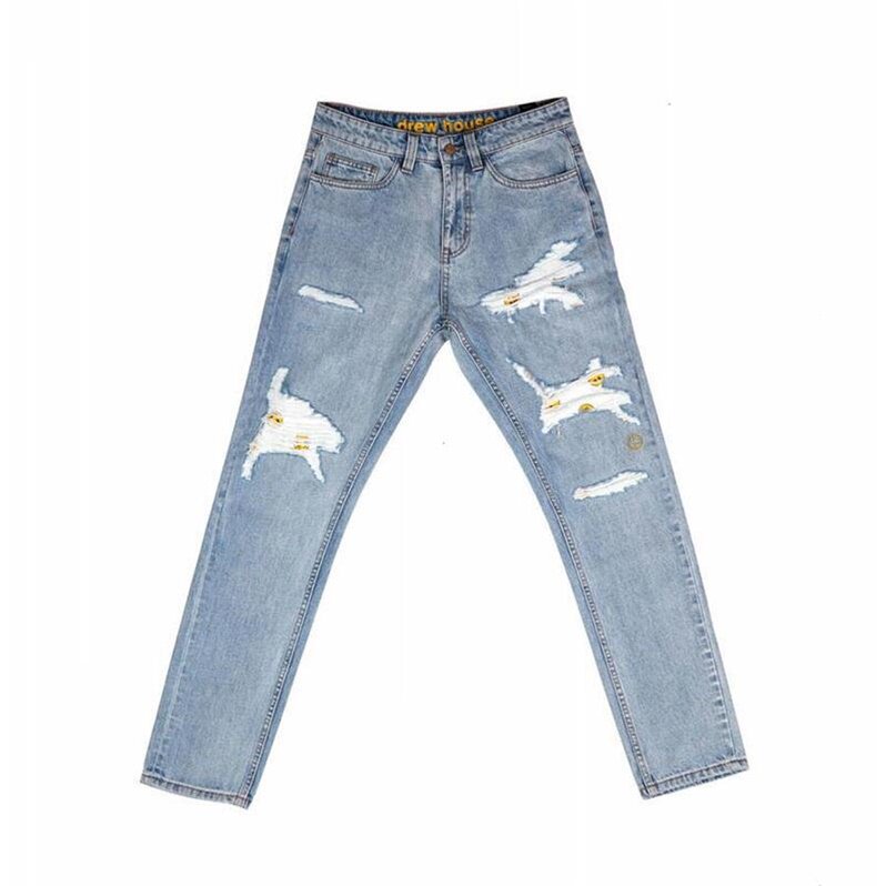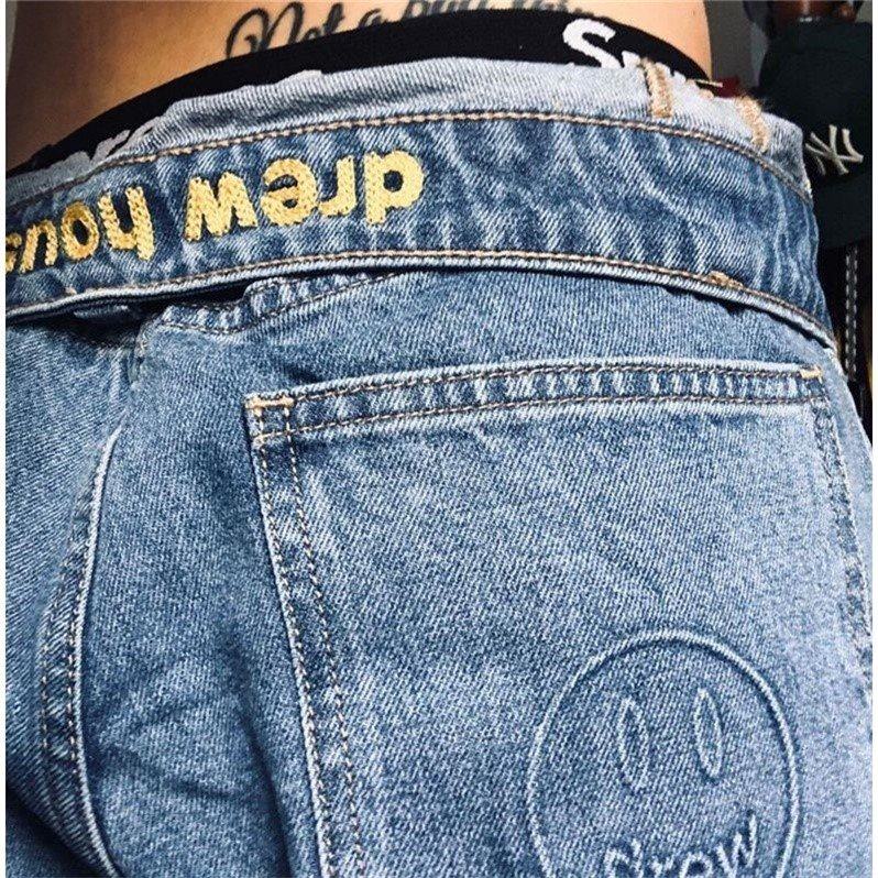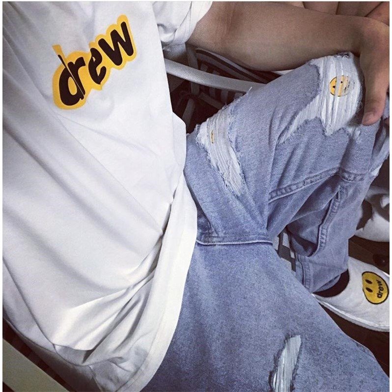 📚 现货比伯同款 drew笑脸破洞牛仔裤情侣宽松休闲贴布高街Ins长裤男
