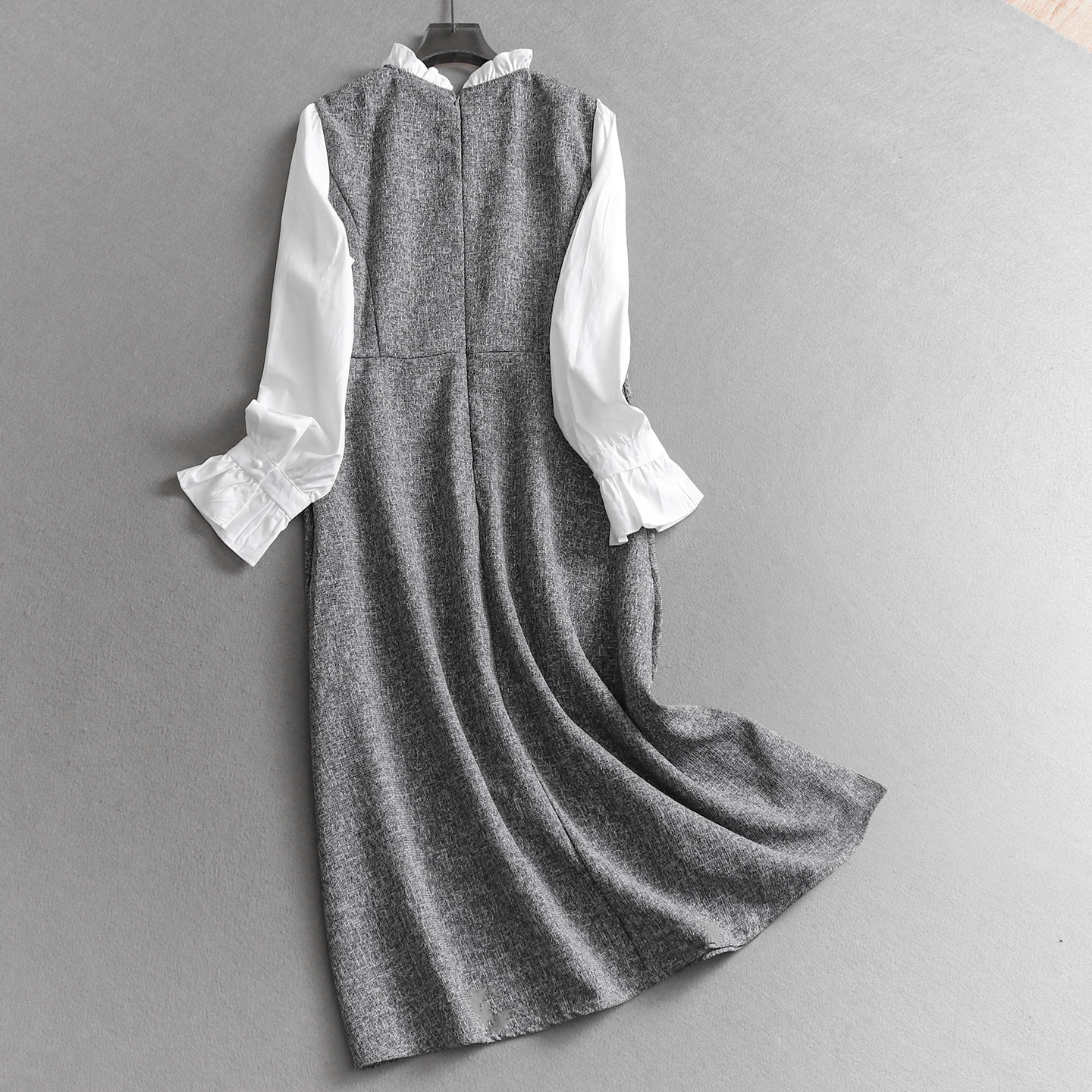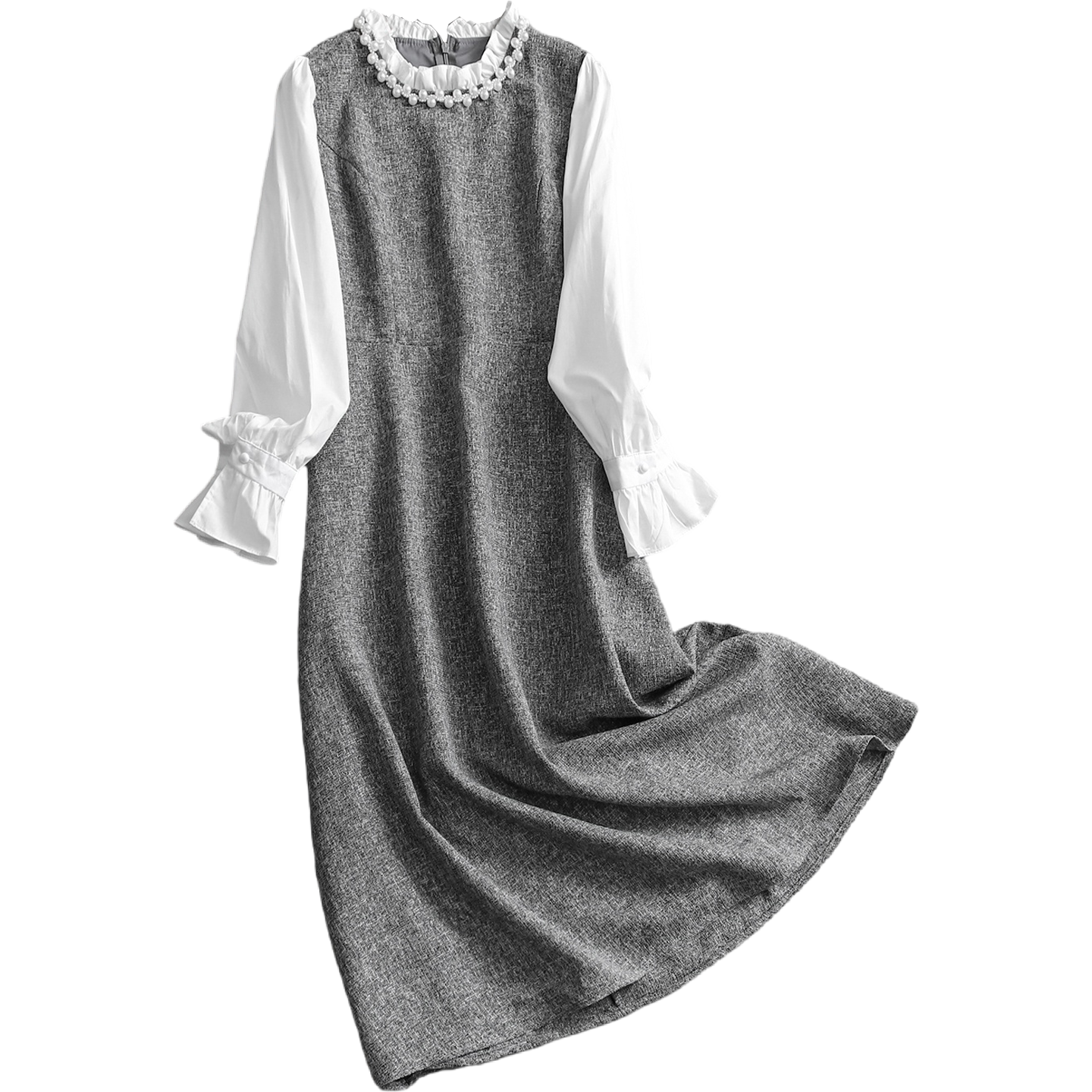 📚 珍珠荷叶立领撞色拼接喇叭袖法式千金风假两件长袖女裙连衣裙Q697