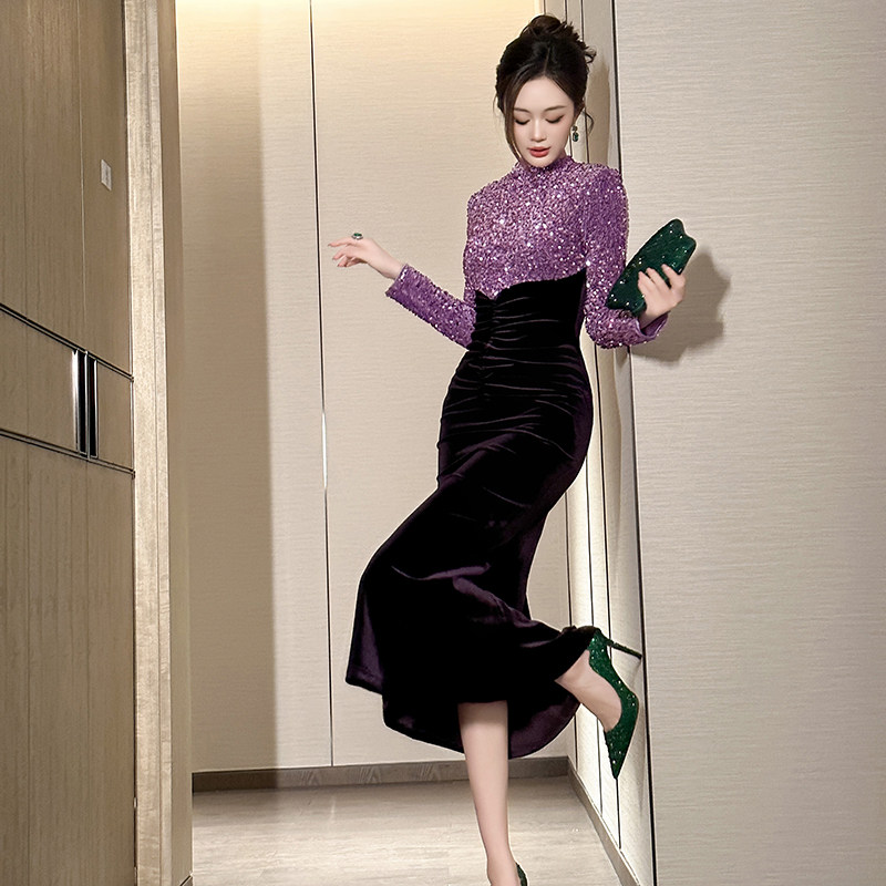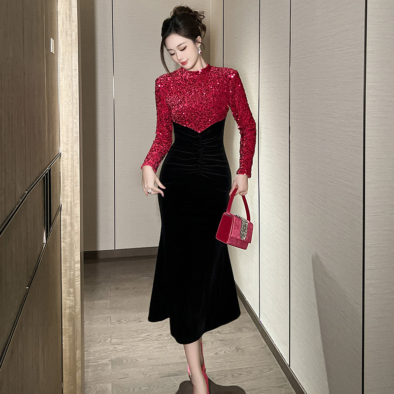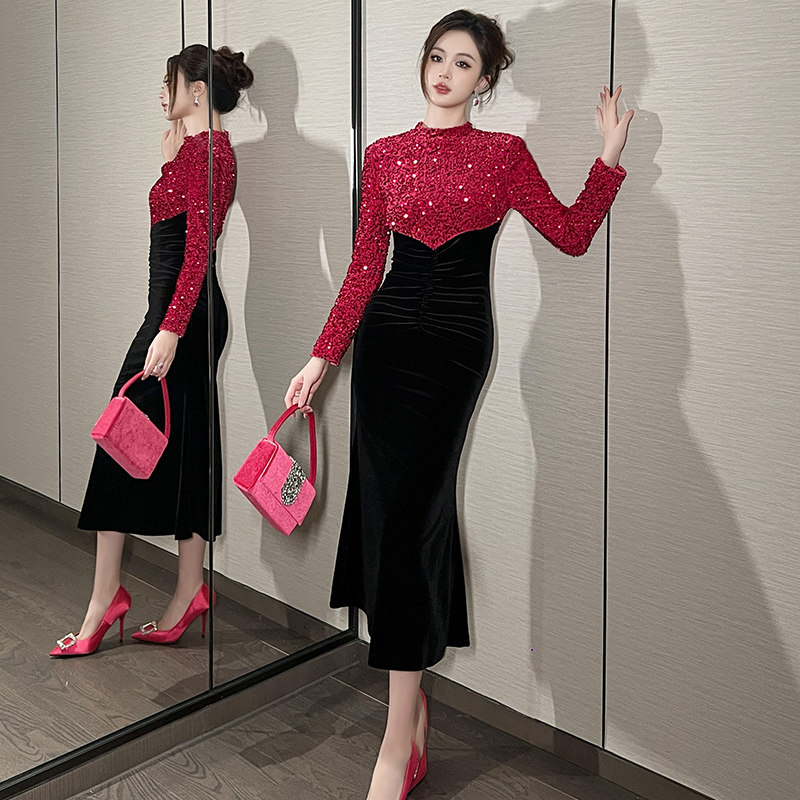 #欧洲站 #名媛风 #拼接丝绒长裙 #气质轻奢 #显瘦修身 #包臀设计 #券后价239元