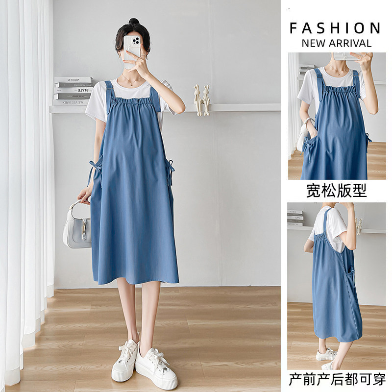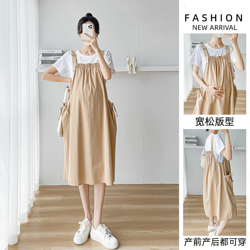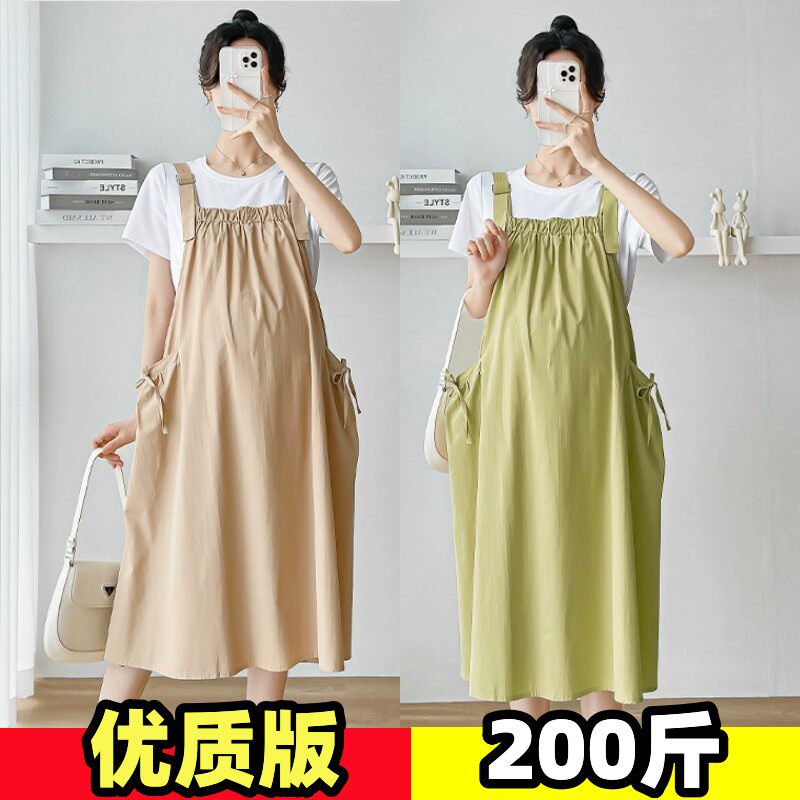 📚 大码孕妇夏季减龄吊带连衣裙纯w棉白色T恤两件套口袋背带裙子200