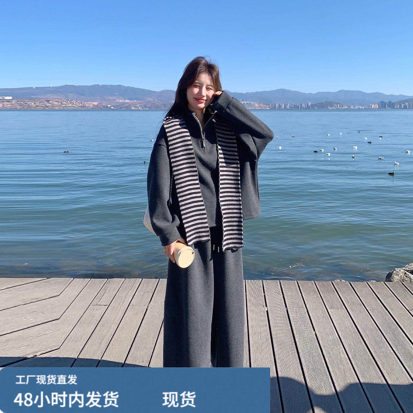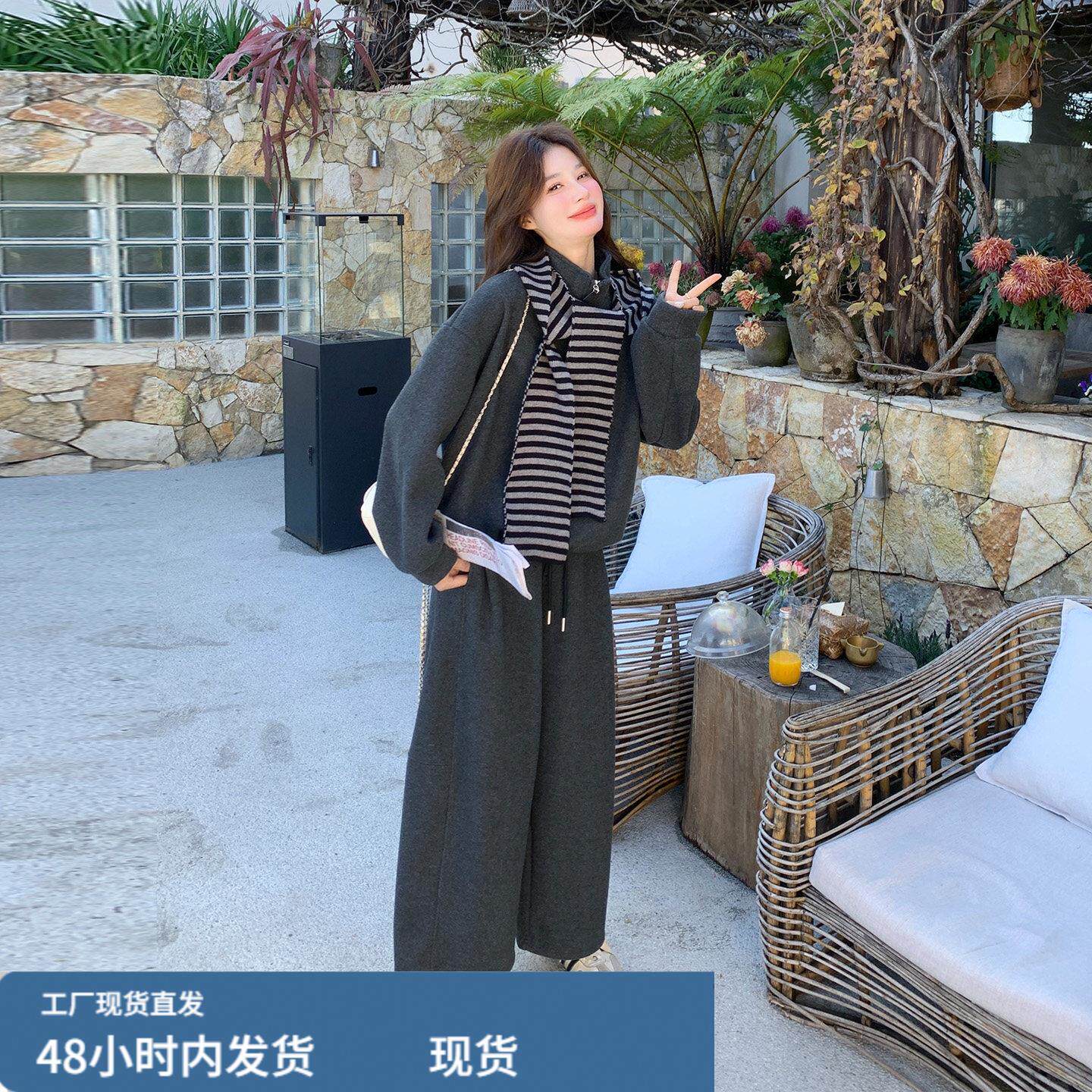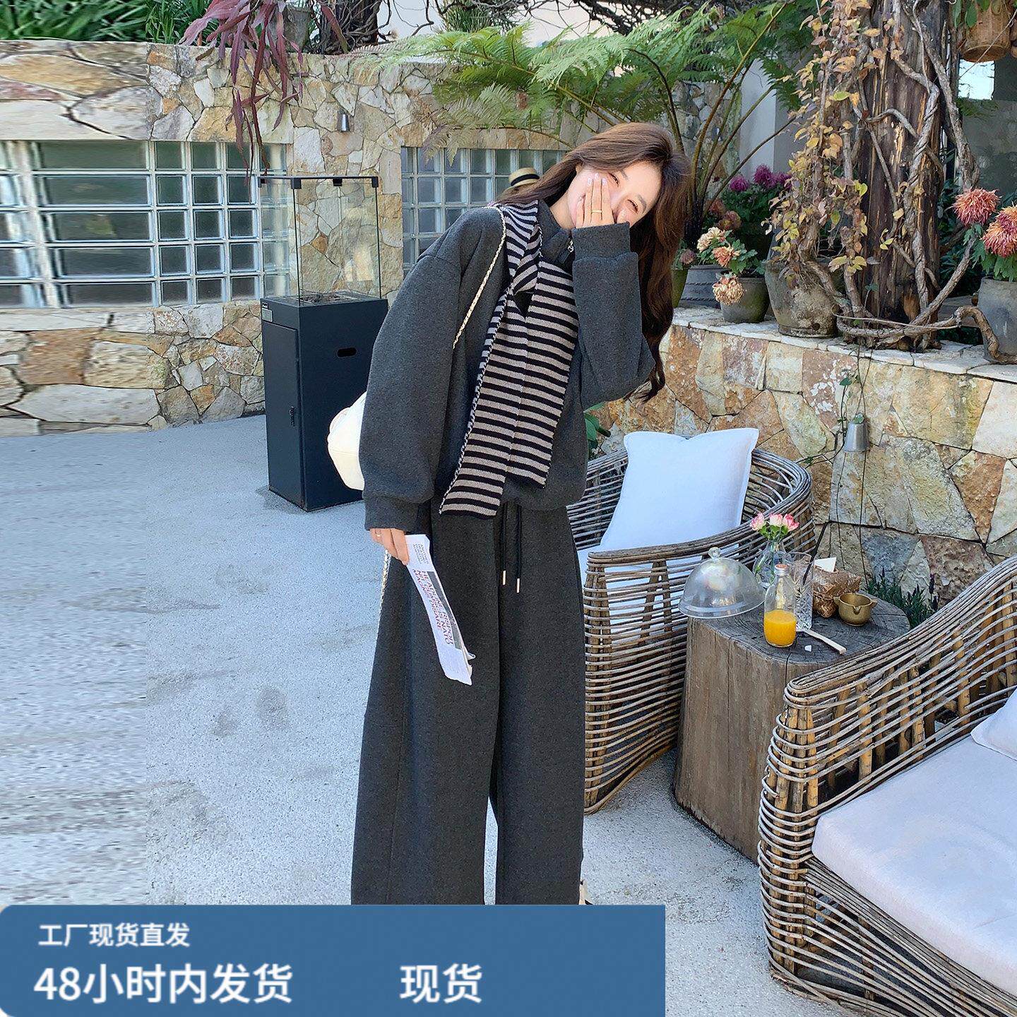 📚 灰色条纹连帽运动衫休闲裤套装2025新款女冬春流行爆款小个子两件
