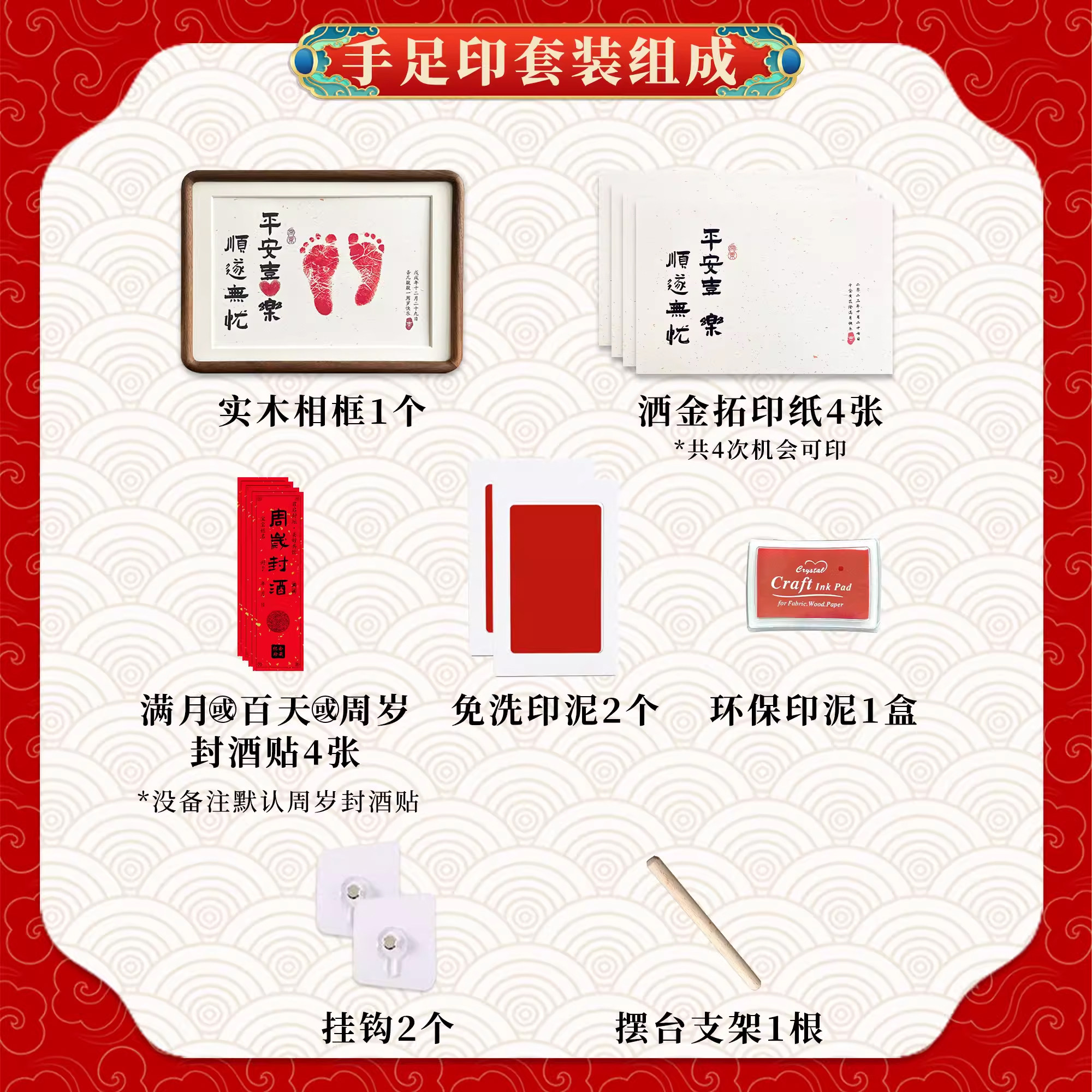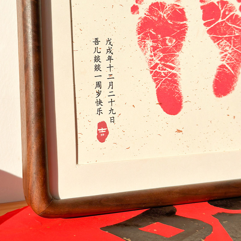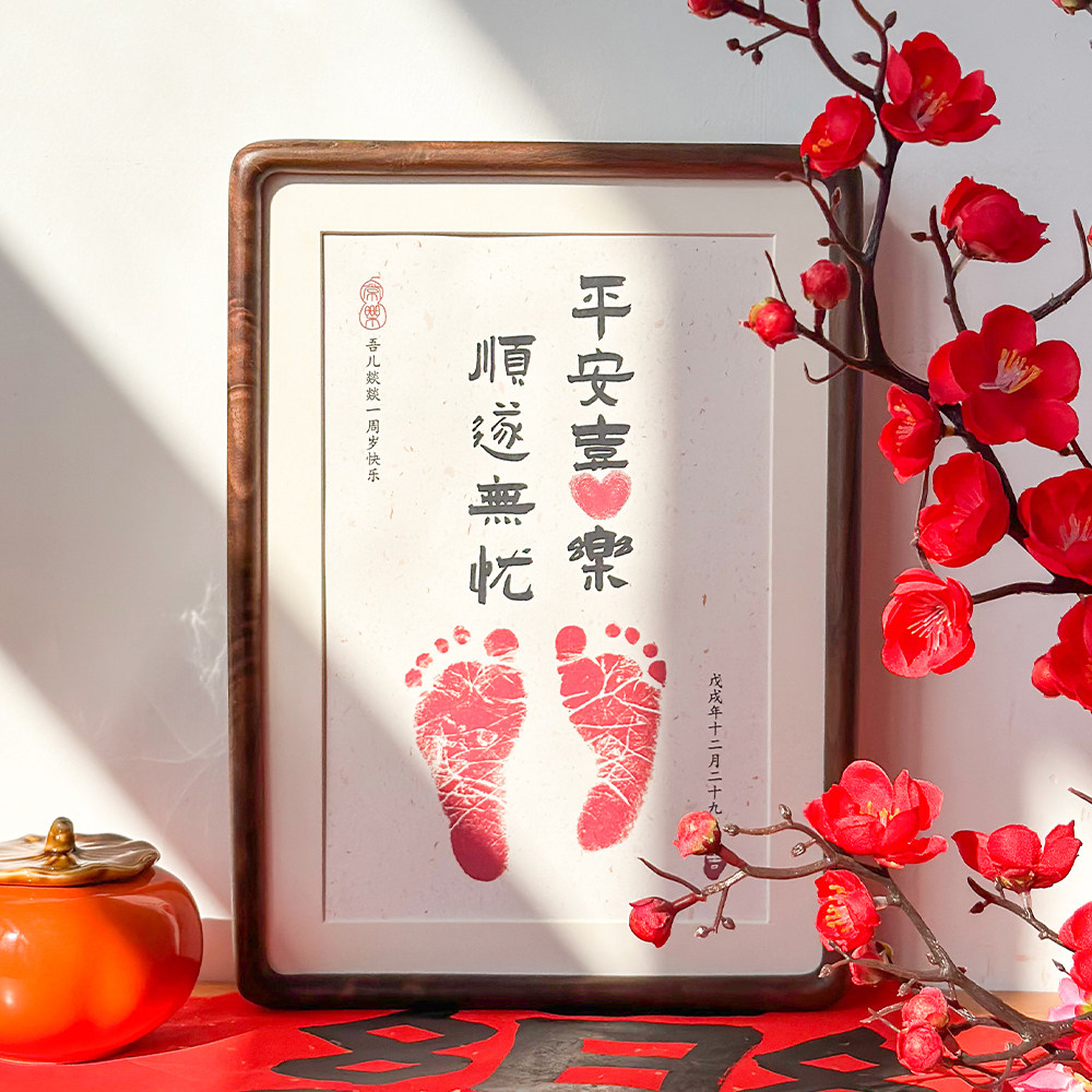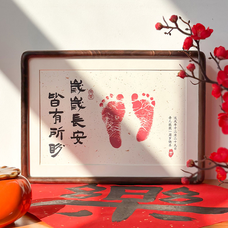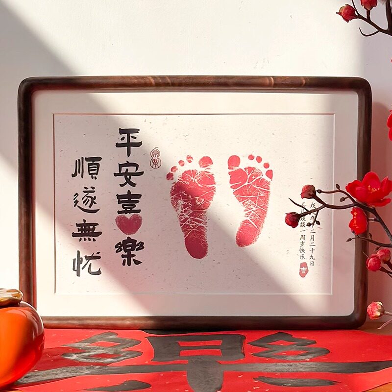 📚 宝宝满月百天周岁手足印定制摆台 手脚印纪念 书法实木相框可挂墙