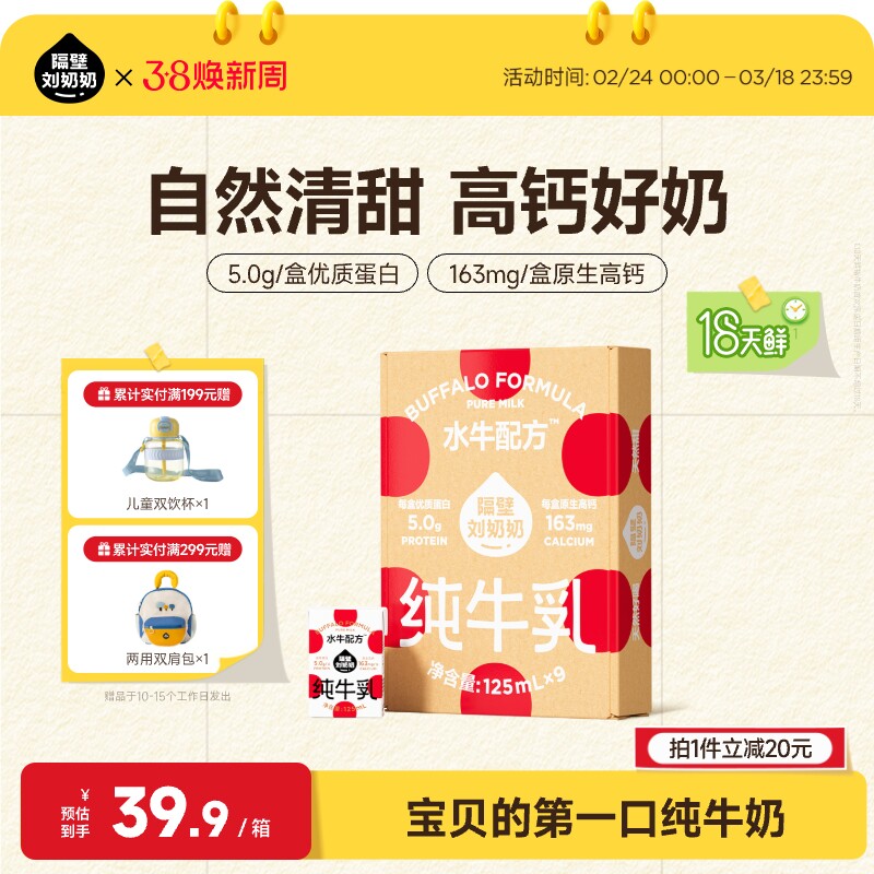 📚 【18天鲜】隔壁刘奶奶4.0蛋白水牛配方mini奶125ml*9盒高钙牛奶