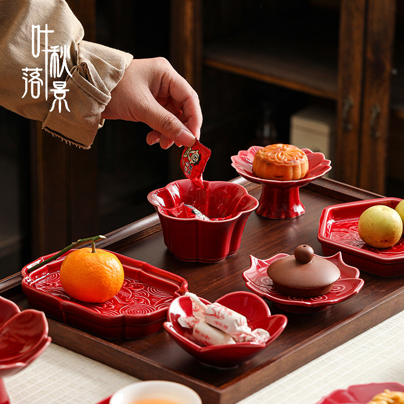 📚 陶瓷中式糕点盘高脚点心盘红色订婚布置甜品结婚喜饼婚庆水果摆盘