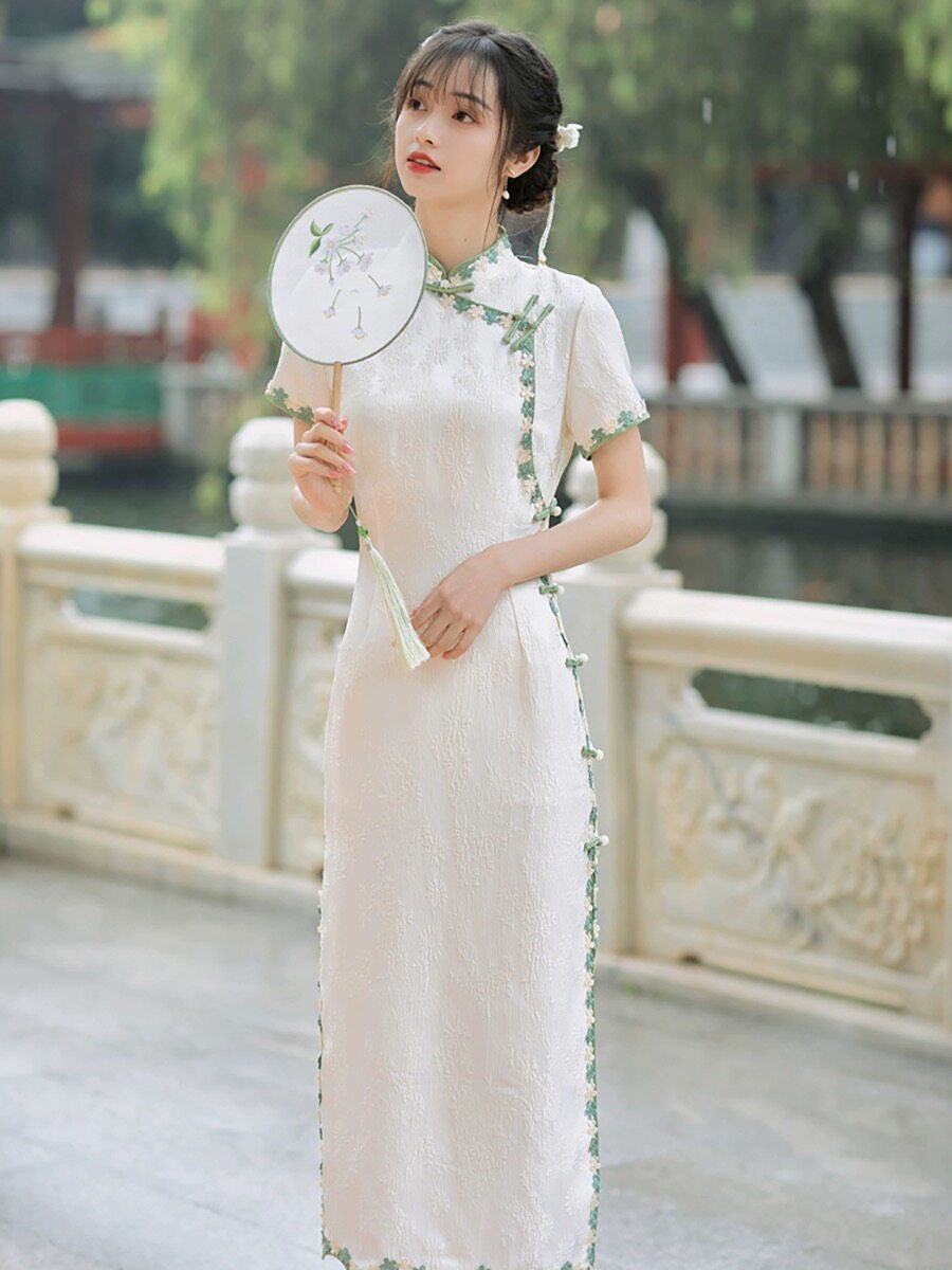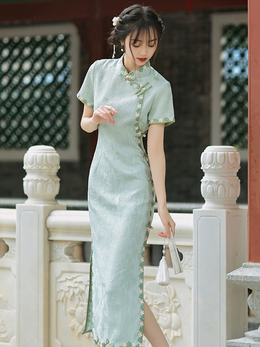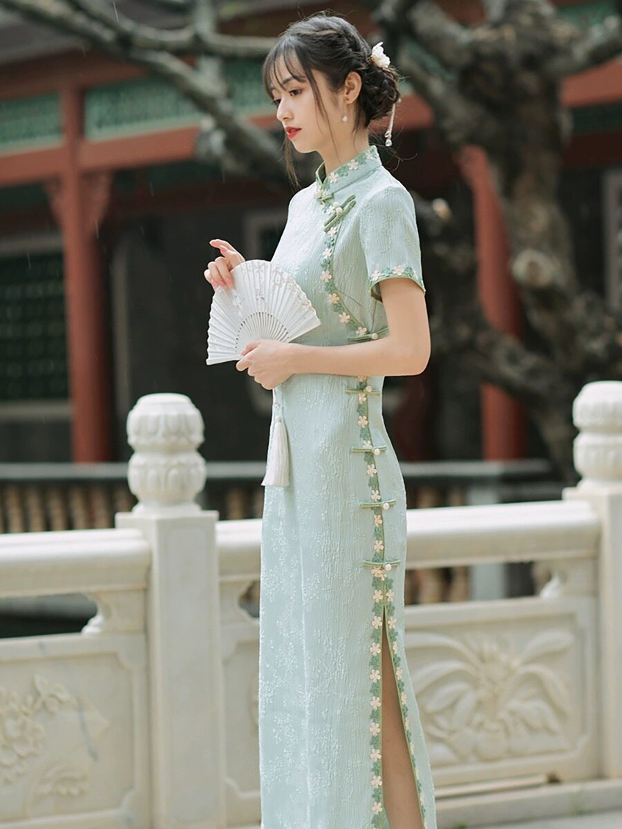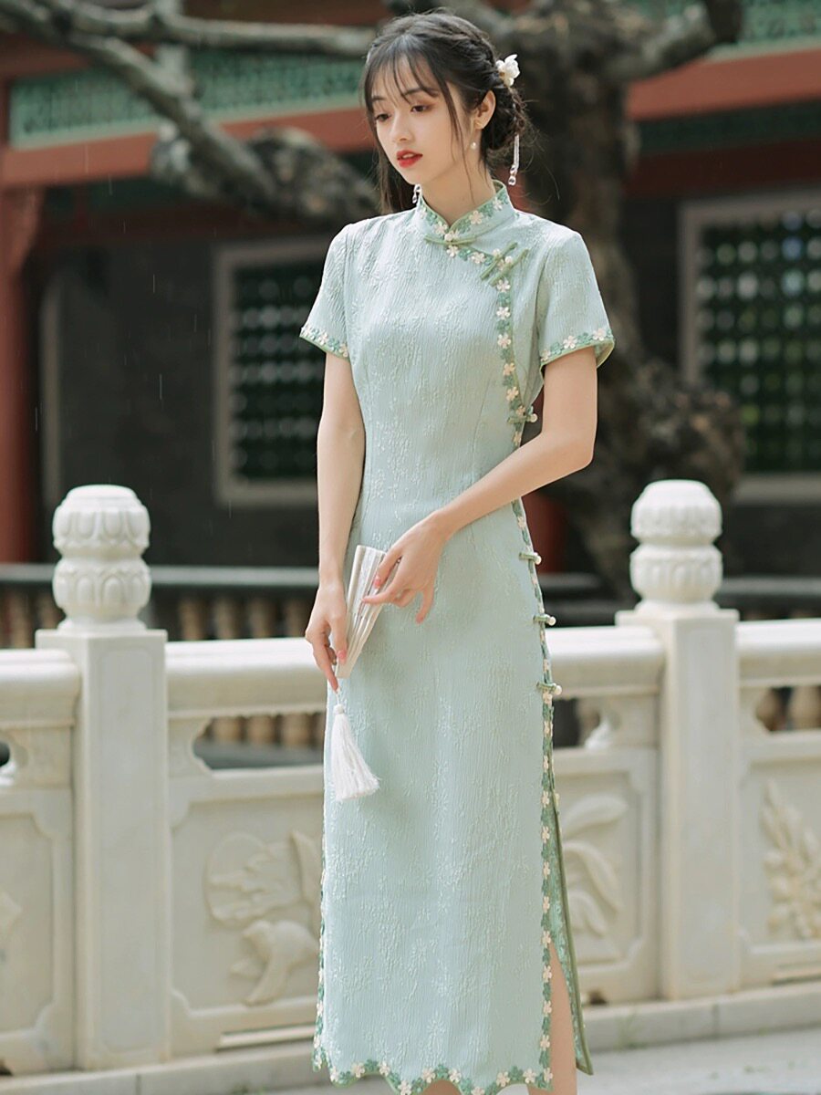 📚 苏式波浪裙摆绿色年轻款少女改良旗袍2023夏季新款小清新日常可穿