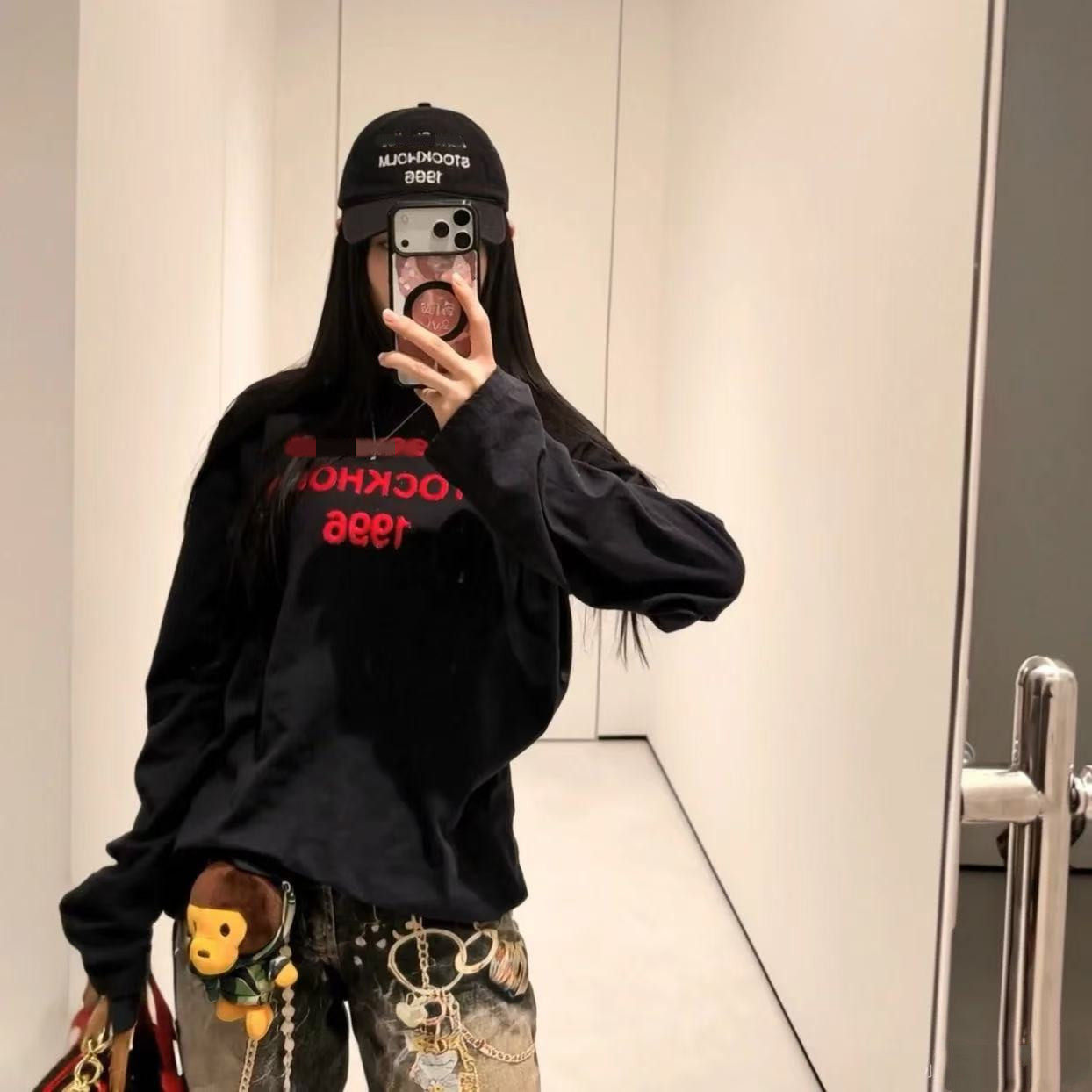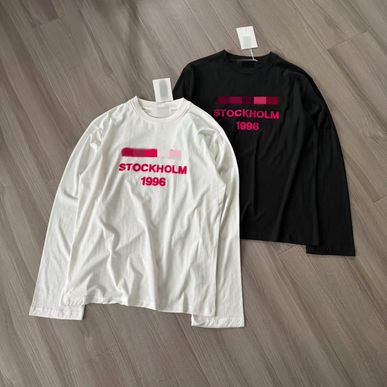 📚 2026新年限定玫红字母植绒1996棉麻宽松圆领长袖T恤男女同款潮