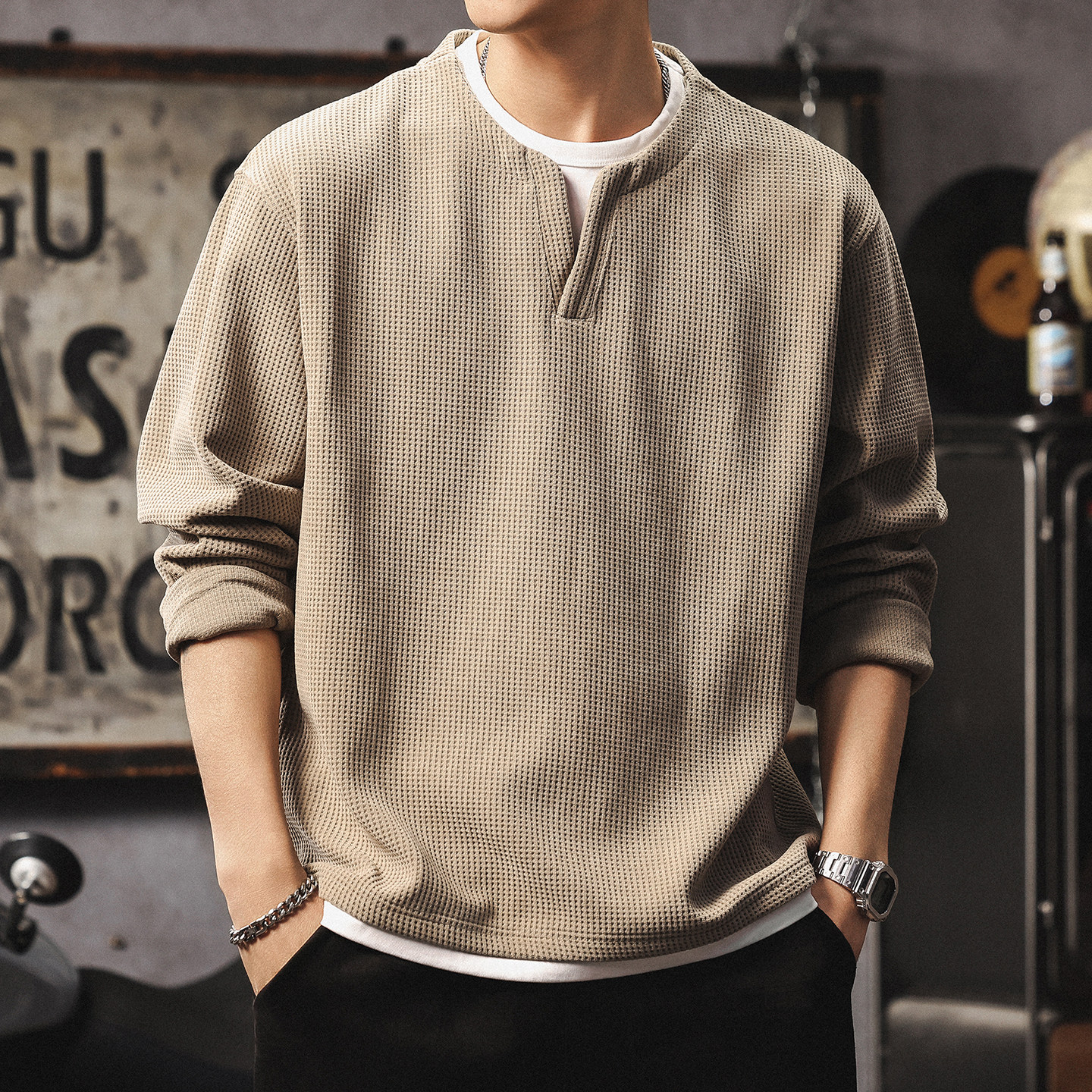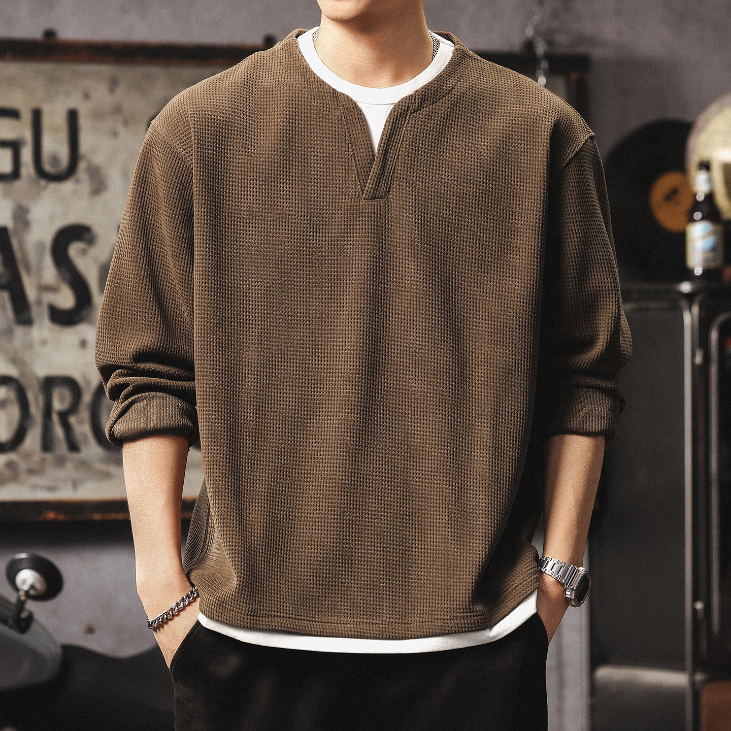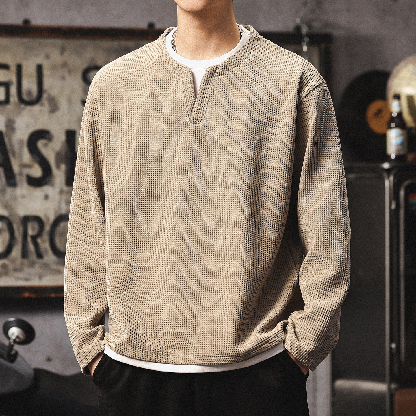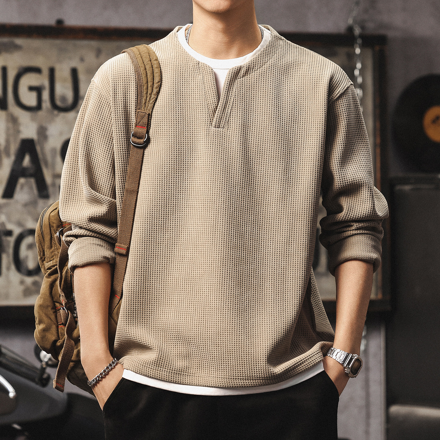 📚 假两件长袖t恤男高级感潮牌v领上衣美式复古华夫格亨利衫打底卫衣