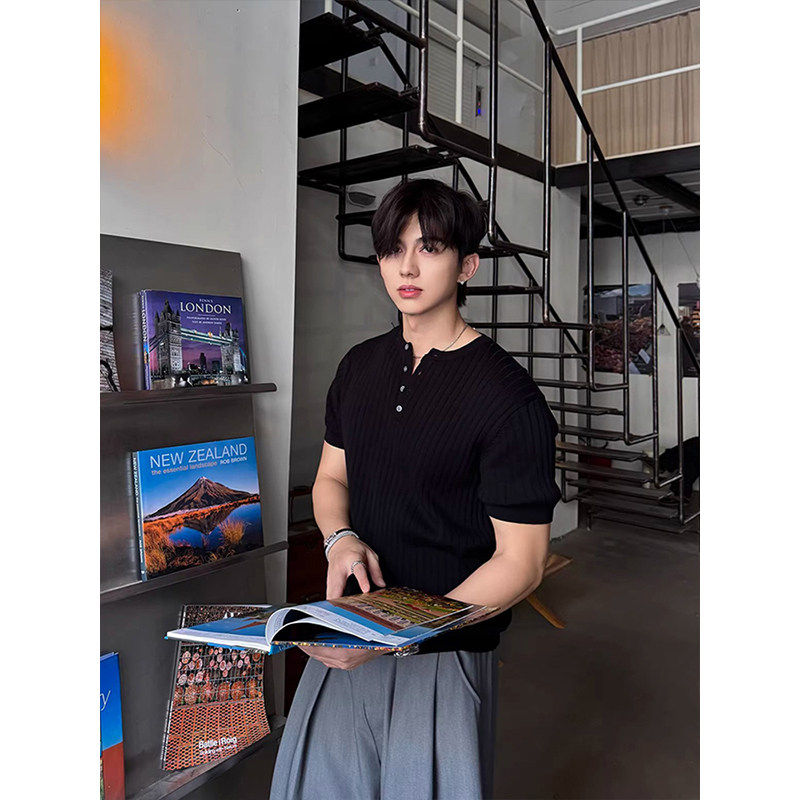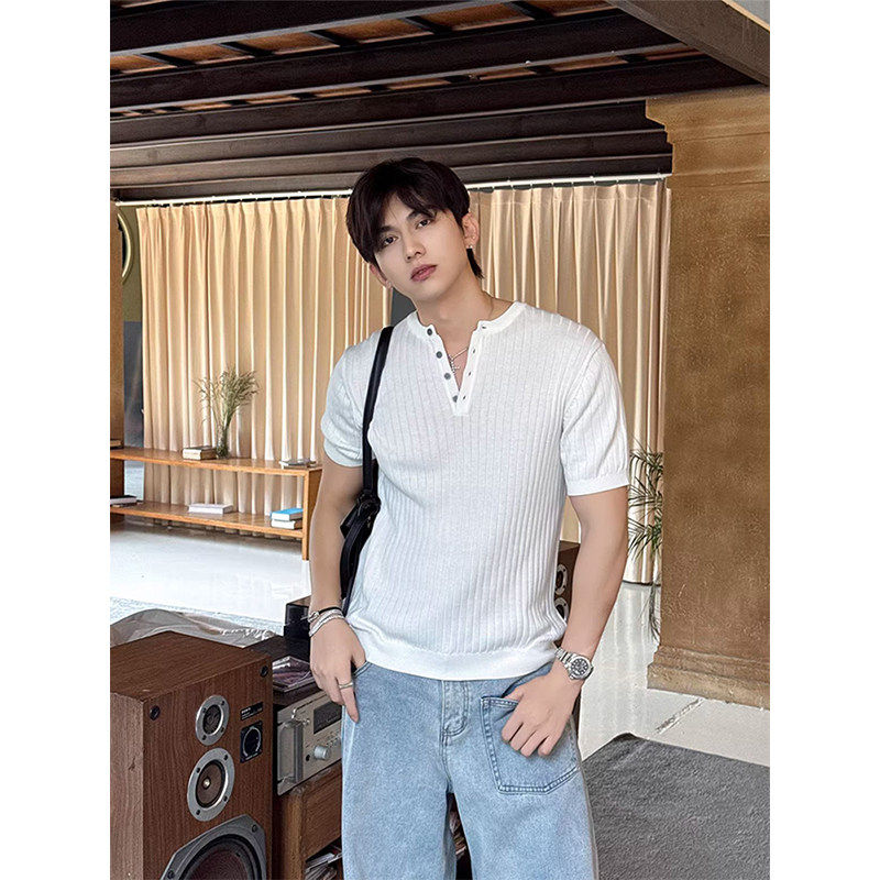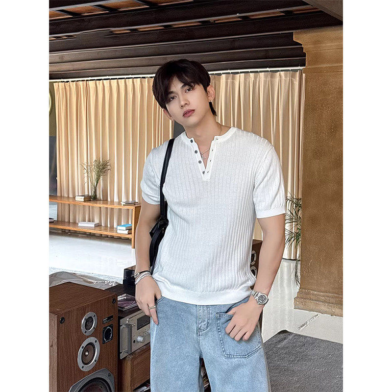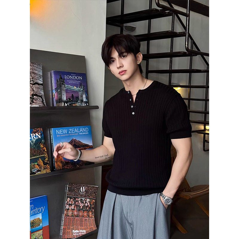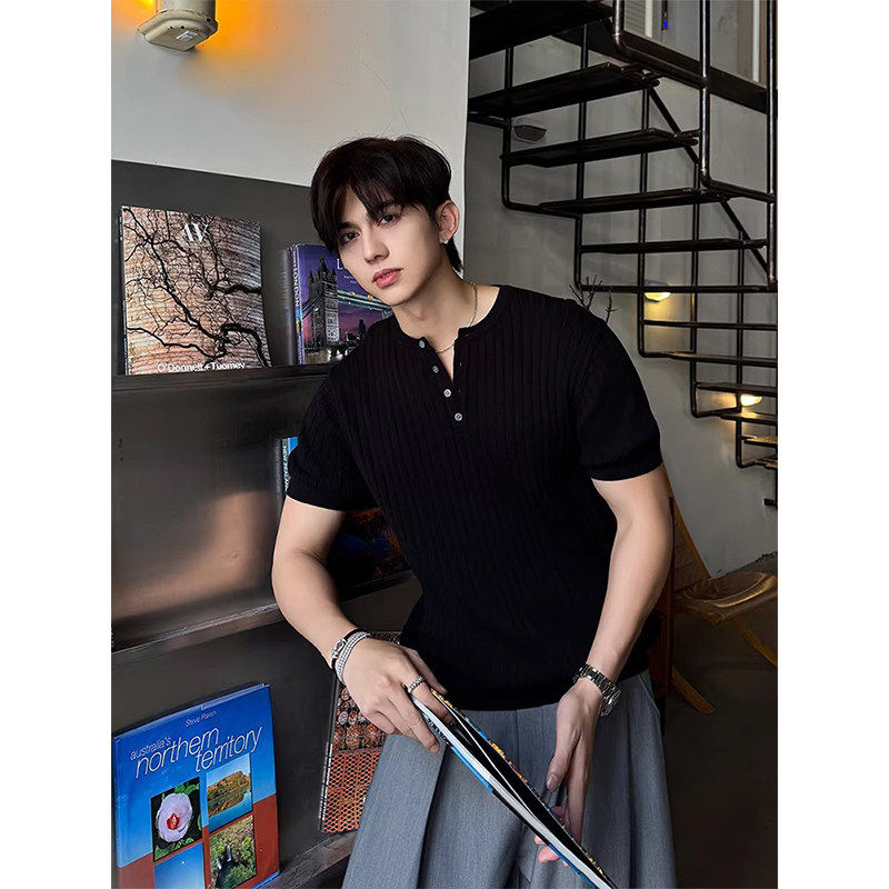 📚 大码300斤硬汉亨利领螺纹短袖T恤男夏季薄款美式轻熟风紧袖口冰丝