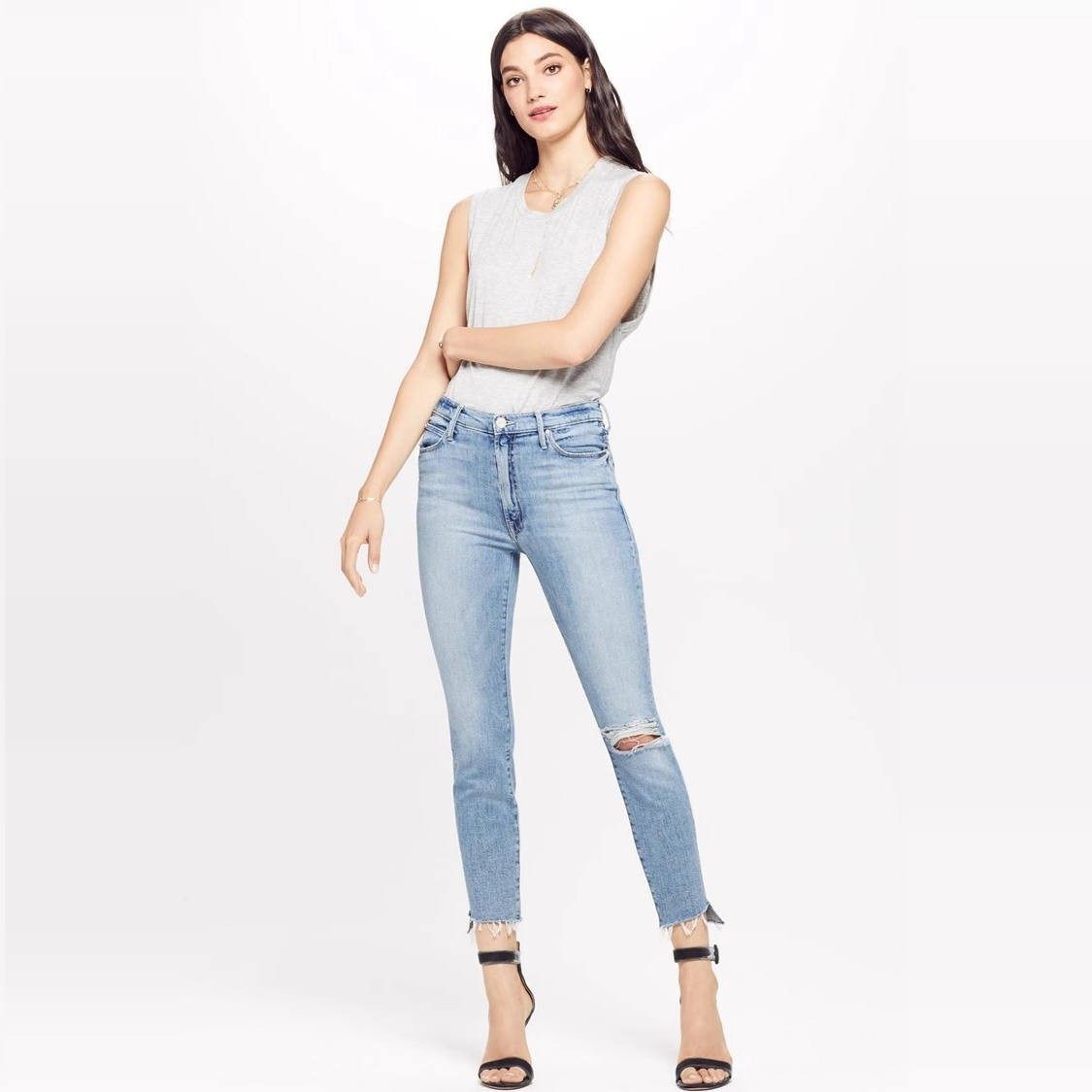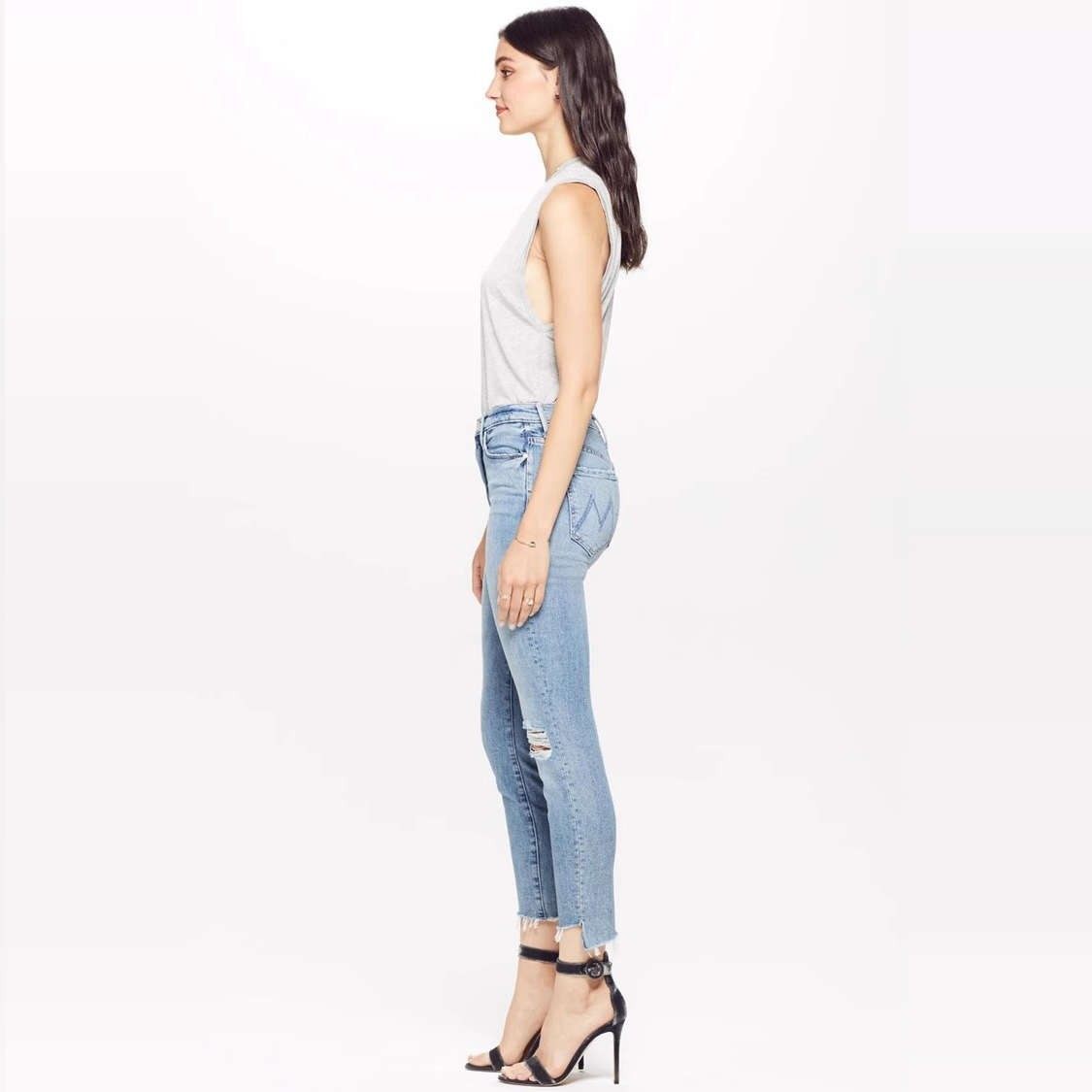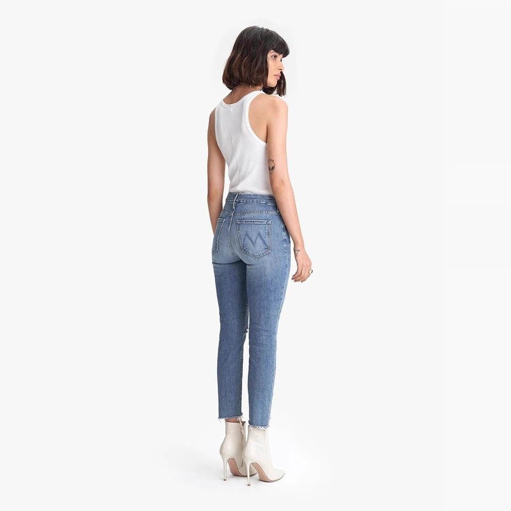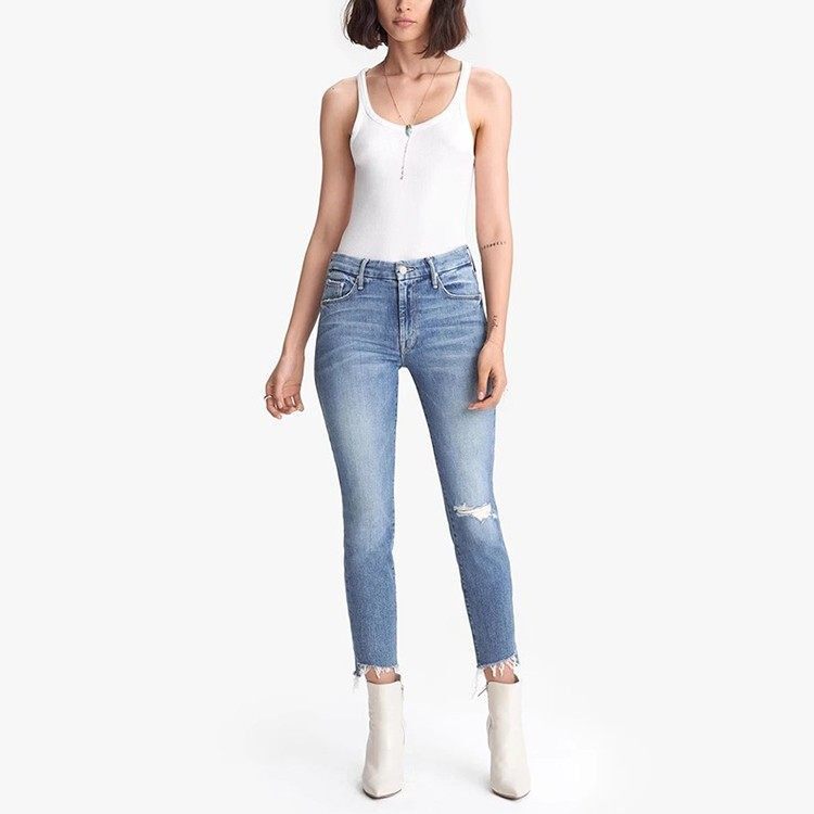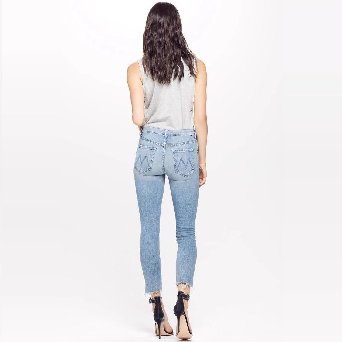 📚 清仓现货 MOTHER 中高腰浅蓝色破洞阶梯毛边须九分小脚牛仔裤女潮