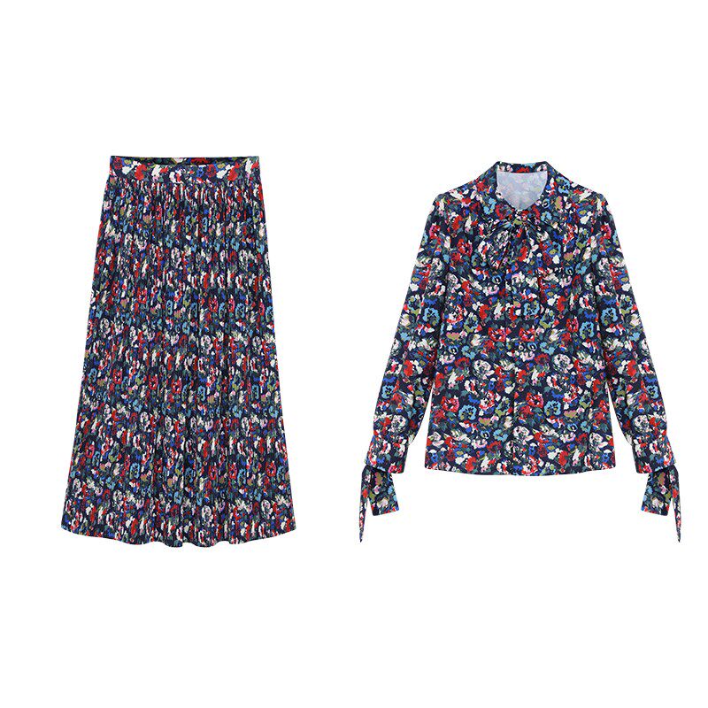 📚 MONA套装女秋冬洋气碎花开叉雪纺百褶半身裙气质上衣衬衫两件套