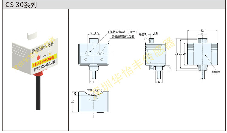 📚 华怡丰非接触式水位检测开关电容式管道液位接近传感器CS30-AN1D