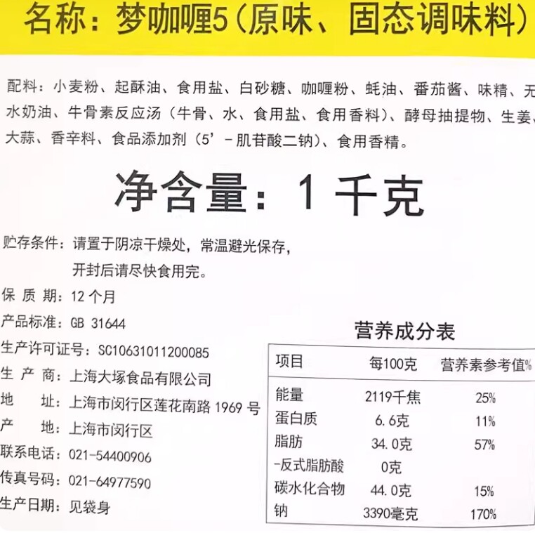 📚 大冢梦咖喱粉1000g日式黄咖喱蛋包饭土豆炖牛肉调料商用餐饮家庭