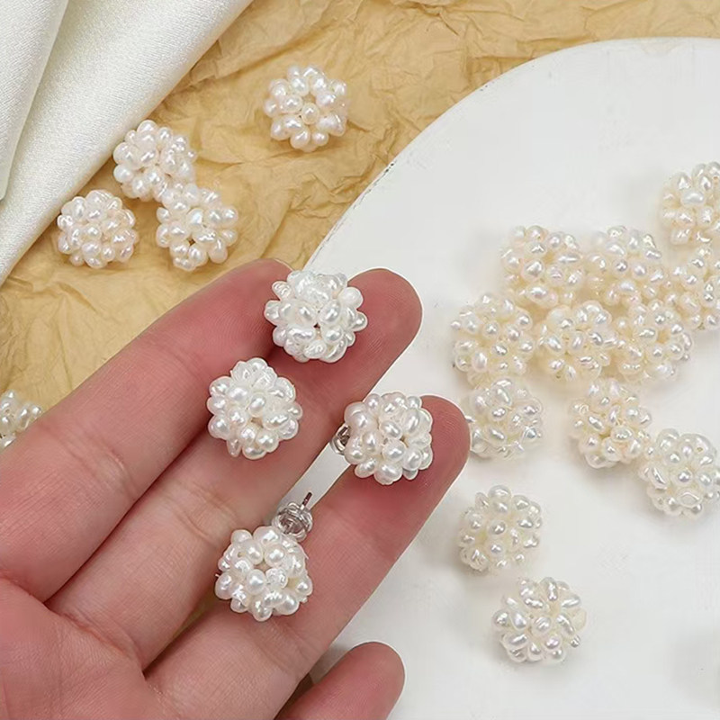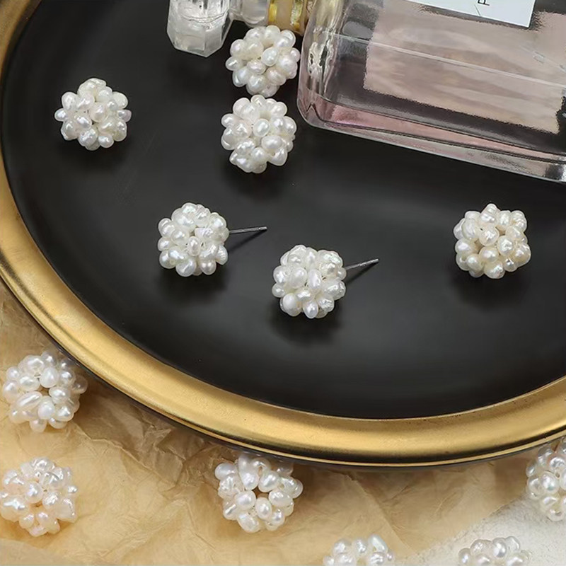 📚 丝艺 法式复古珍珠耳钉天然淡水925银针手工编织花球荷静同款耳环