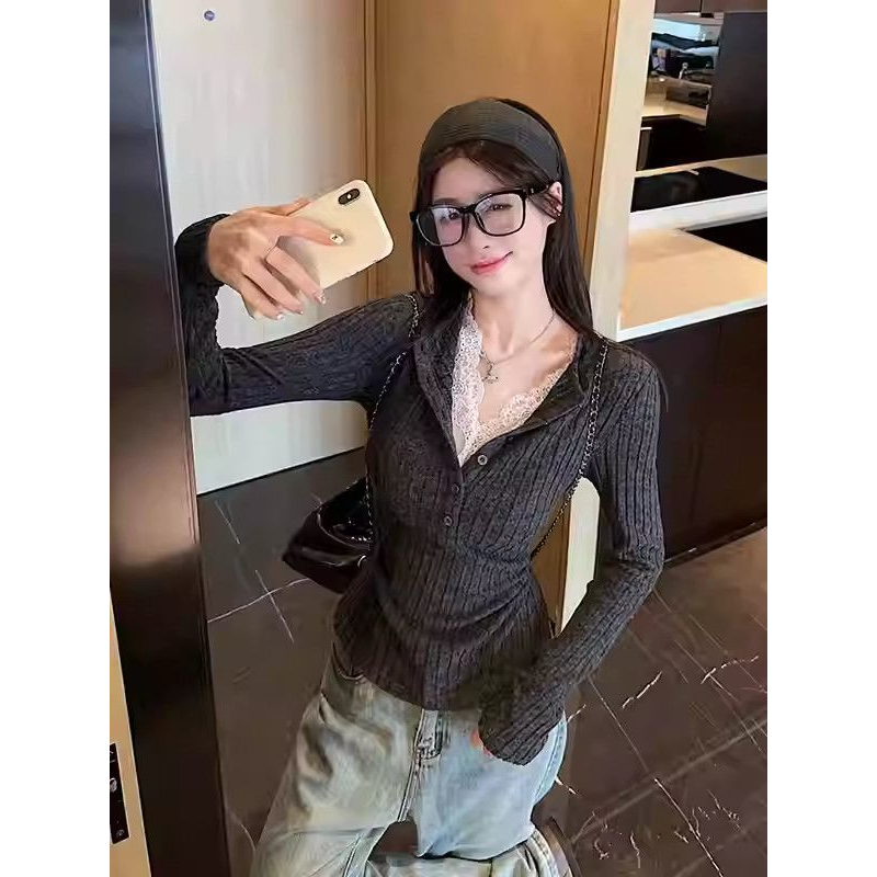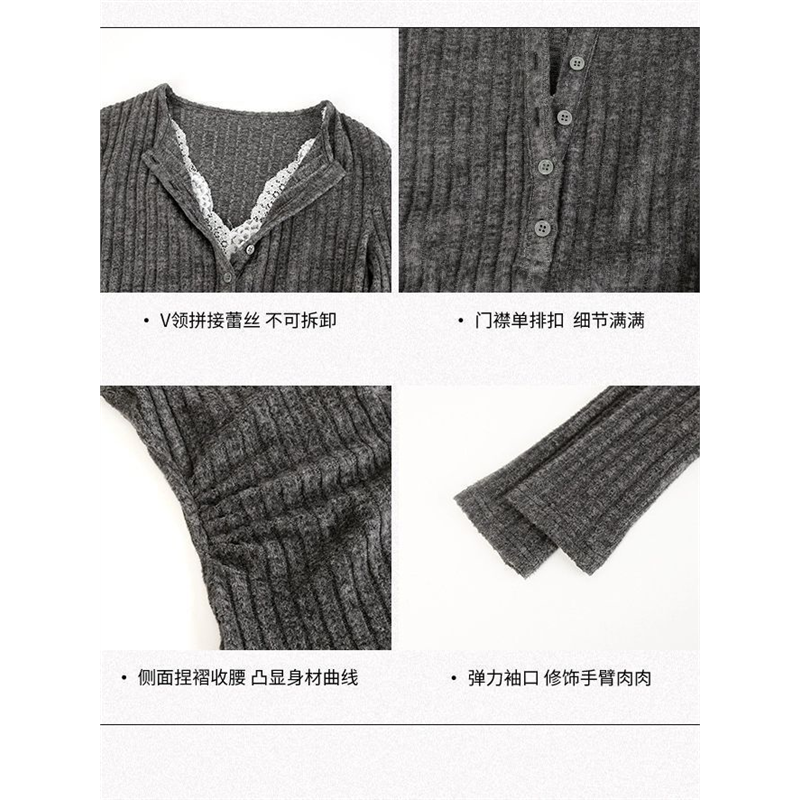 📚 Forever21气质灰色蕾丝假两件V领针织小衫女纯欲修身长袖打底上衣