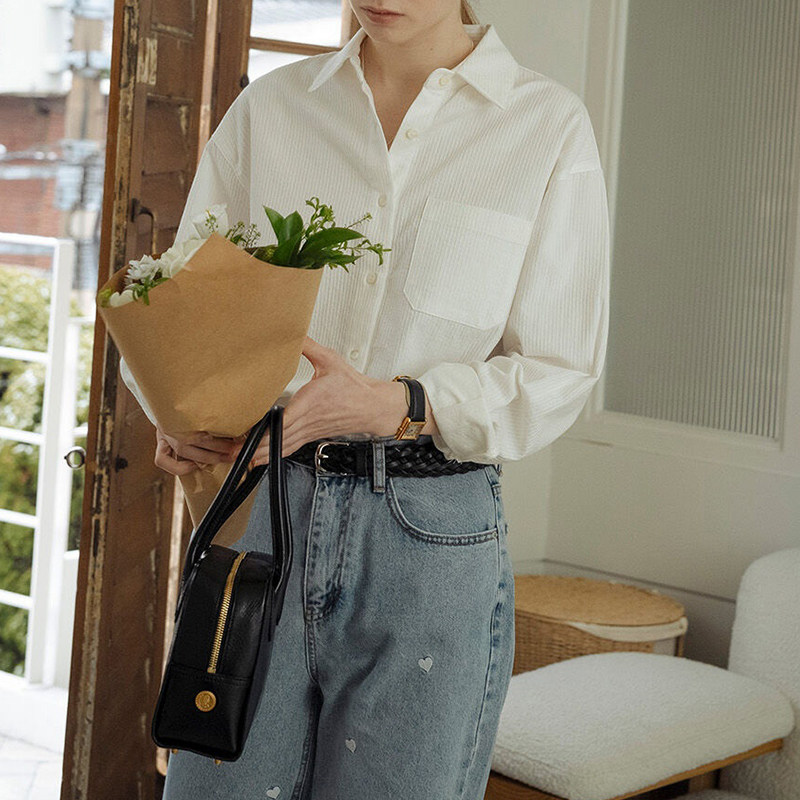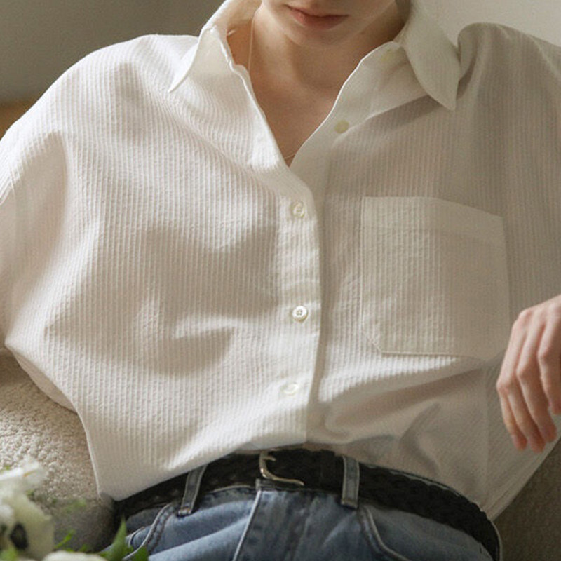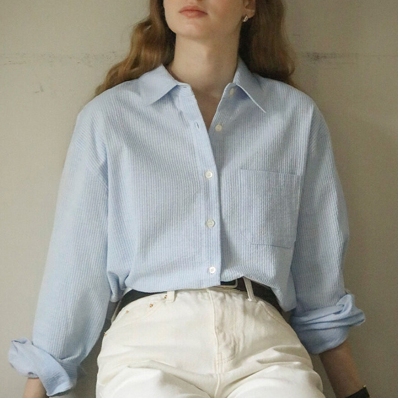 📚 纯棉竖条纹长袖衬衫女上衣25秋冬叠穿内搭高级感休闲白色衬衣女