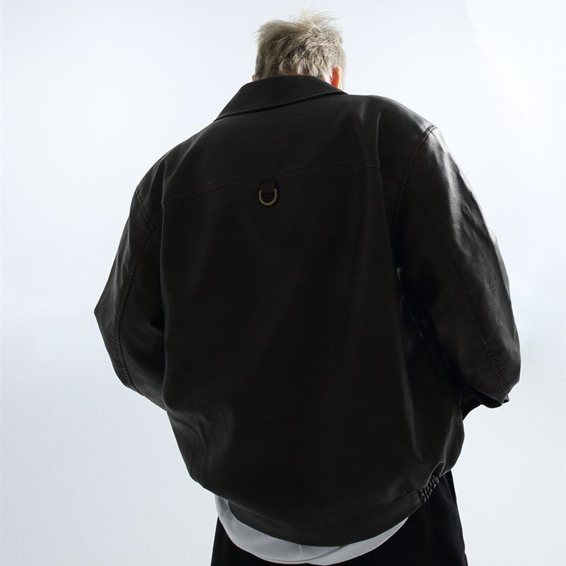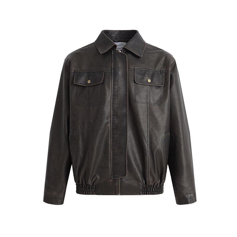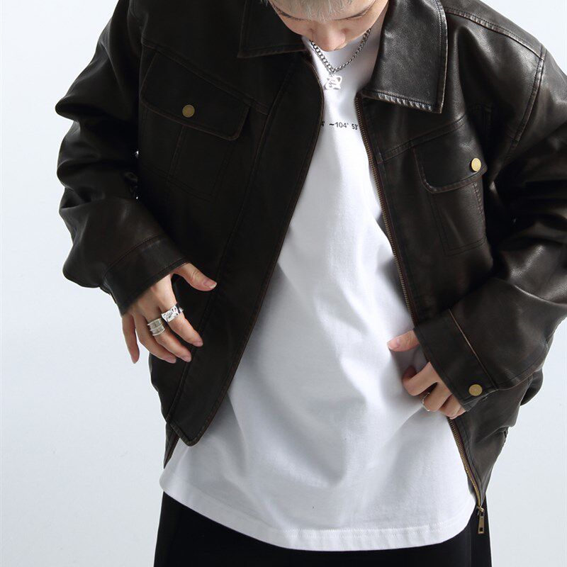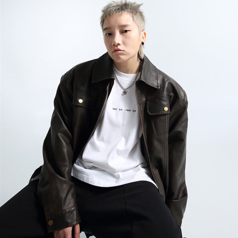 📚 「GRNL」铁锈驳杂 q复古廓形水洗做旧机车外套男女垫肩短款皮夹克