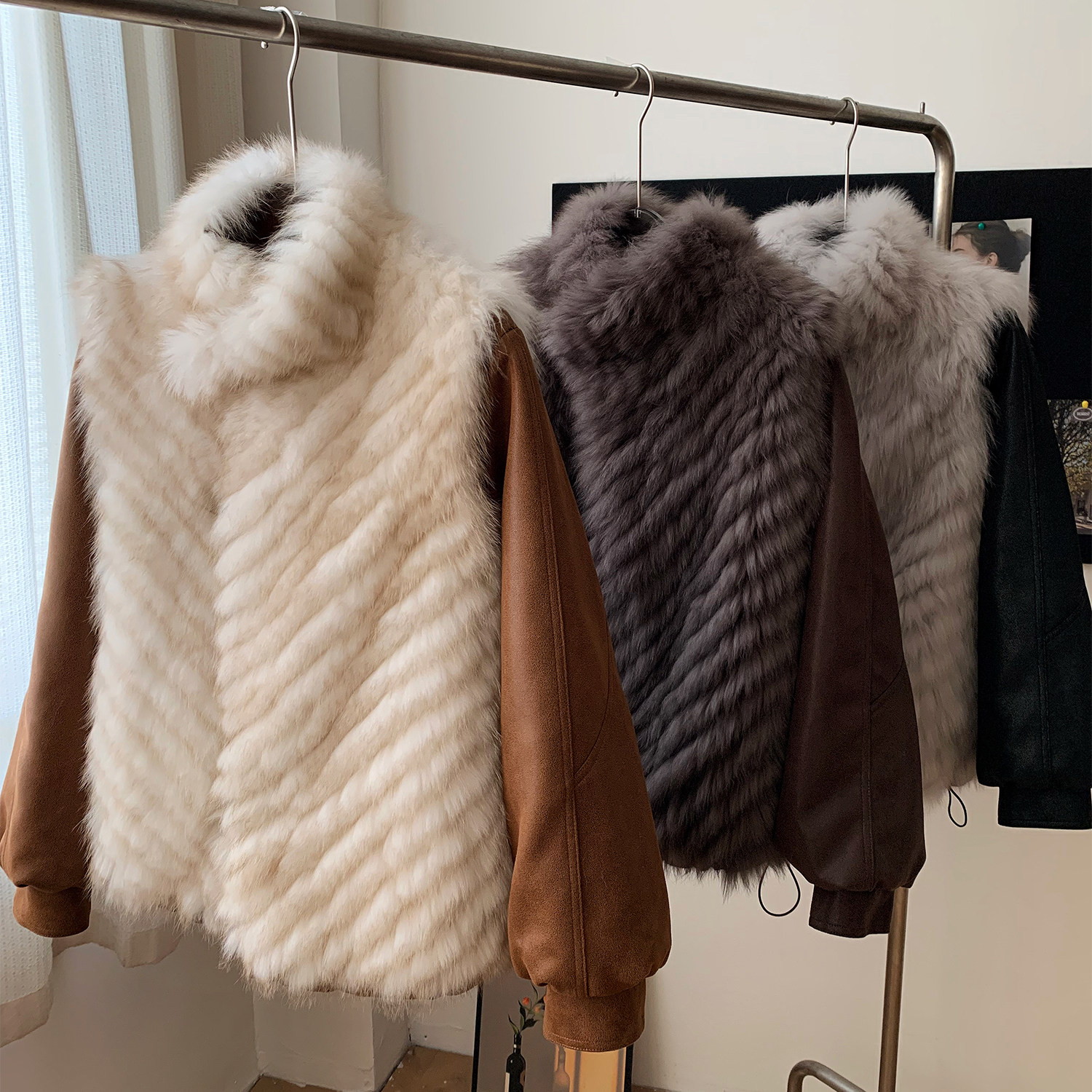 🎩外套的款式新颖独特,双面设计更是增添了几分时尚感。狐狸毛的柔软触感,让人感到无比舒适。车条设计的细节,更是让整个外套看起来更加精致。👌