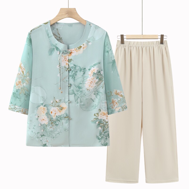 📚 妈妈夏装套装新款国风雪纺衫2025新中式中老年春夏季七分袖上衣女